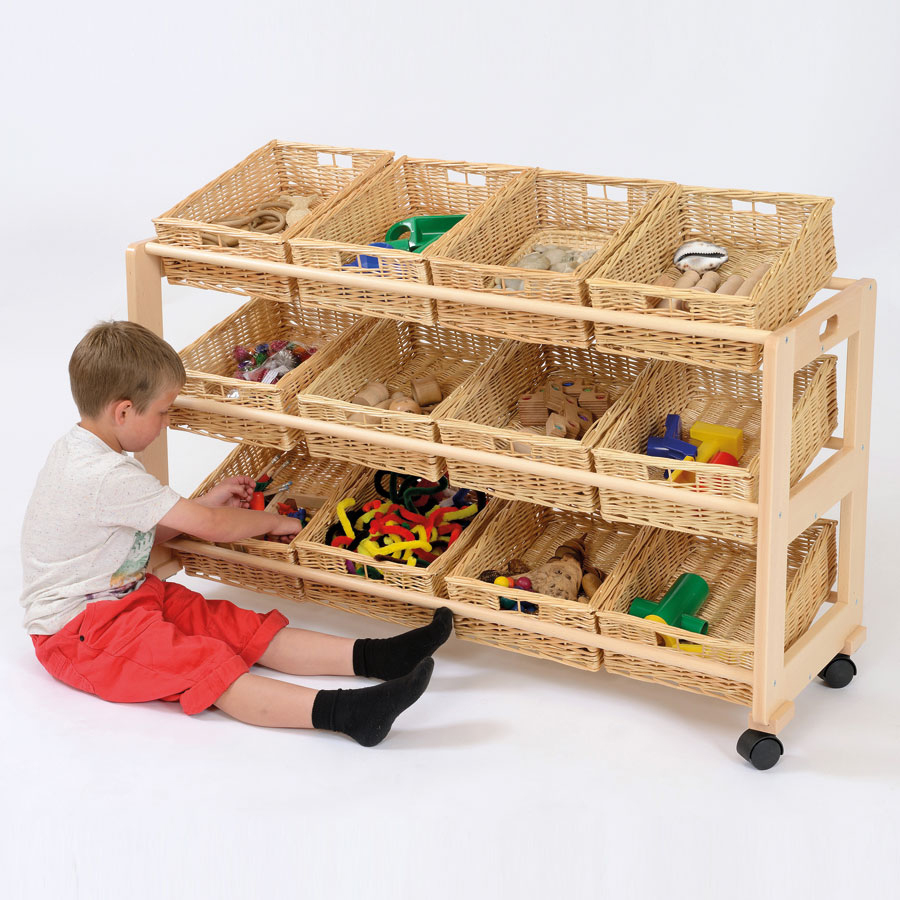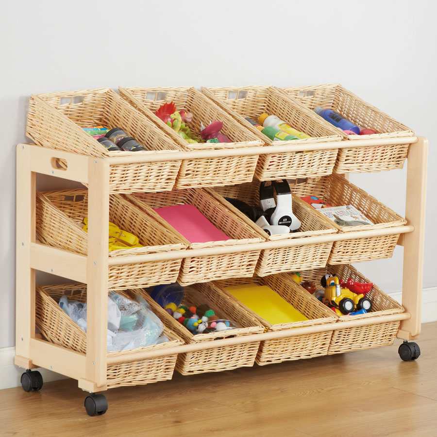 Wooden trolley with tilted baskets providing children with easy assess to resources.
