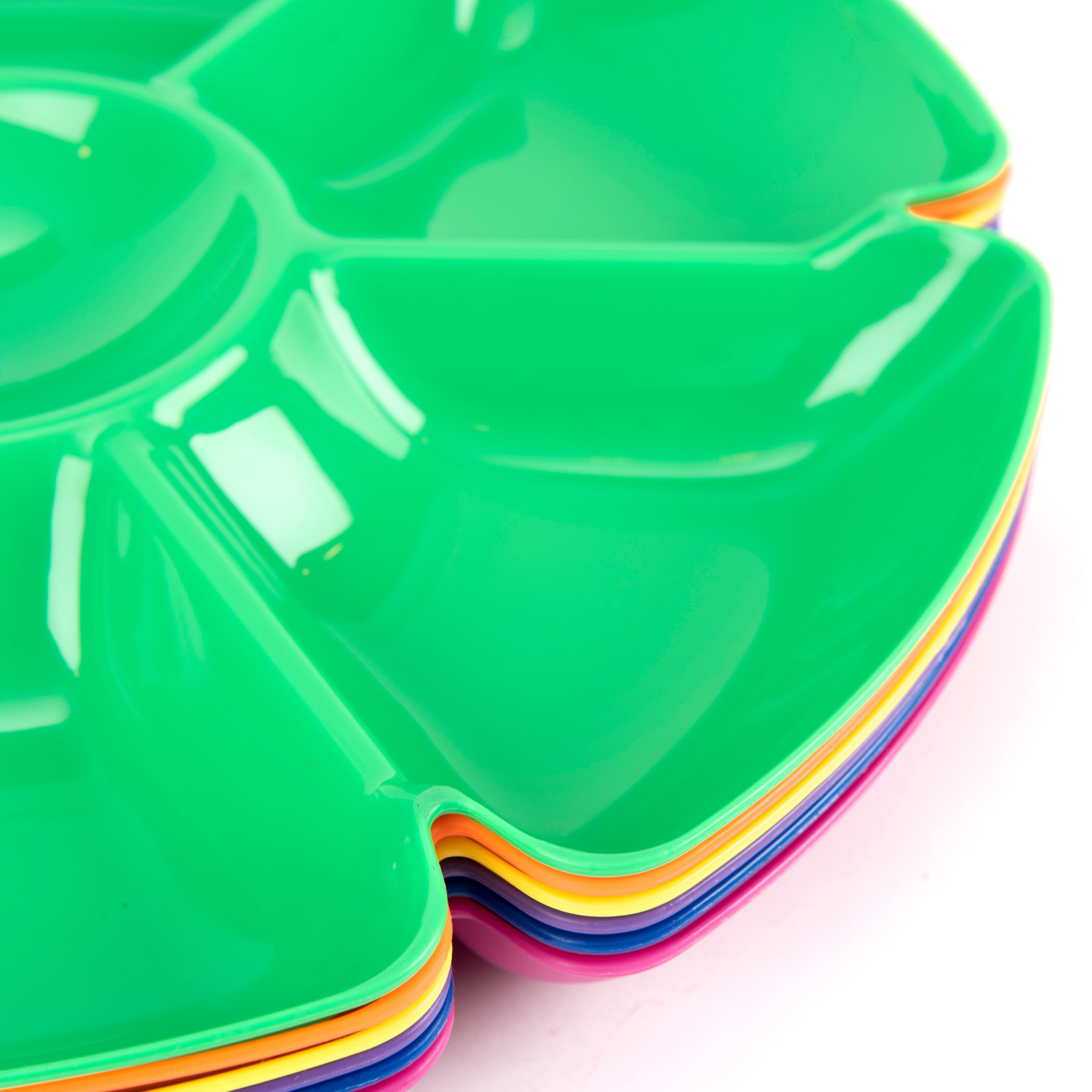 A set of vibrant trays each with seven interior compartments.