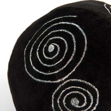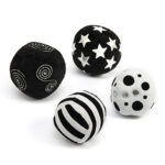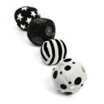 A set of four soft, black and white patterned activity balls.
