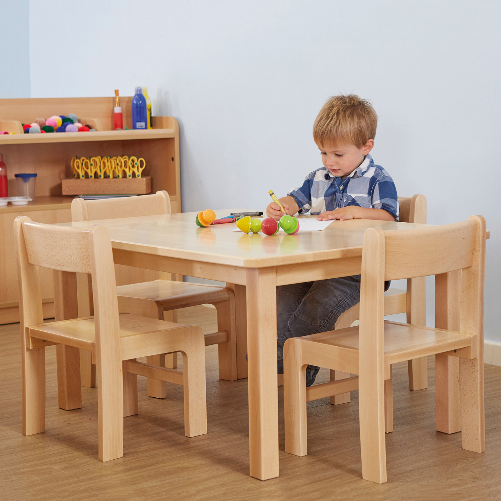 A smaller rectangular table made from solid beech which can seat up to four pupils.