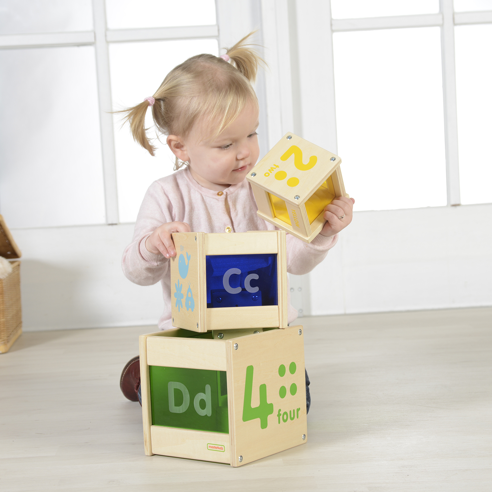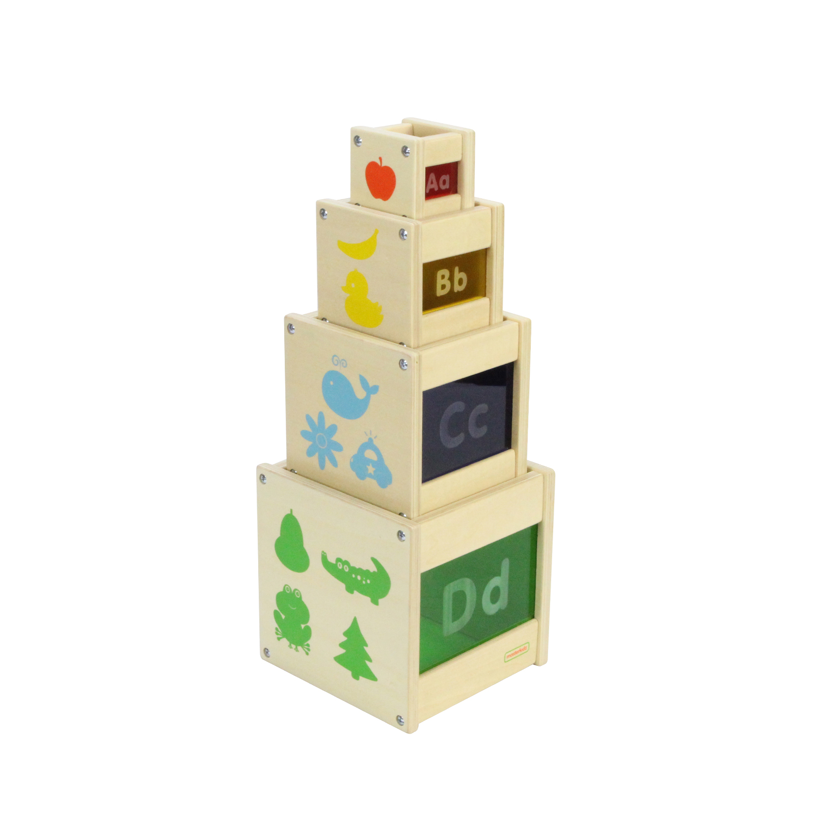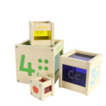 A set of 4 sturdy wooden nesting and stacking cubes printed with alphabet letters, numbers and shapes on the sides.