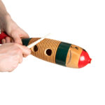 A tri-colour, fish shaped percussion instrument with scraper.
