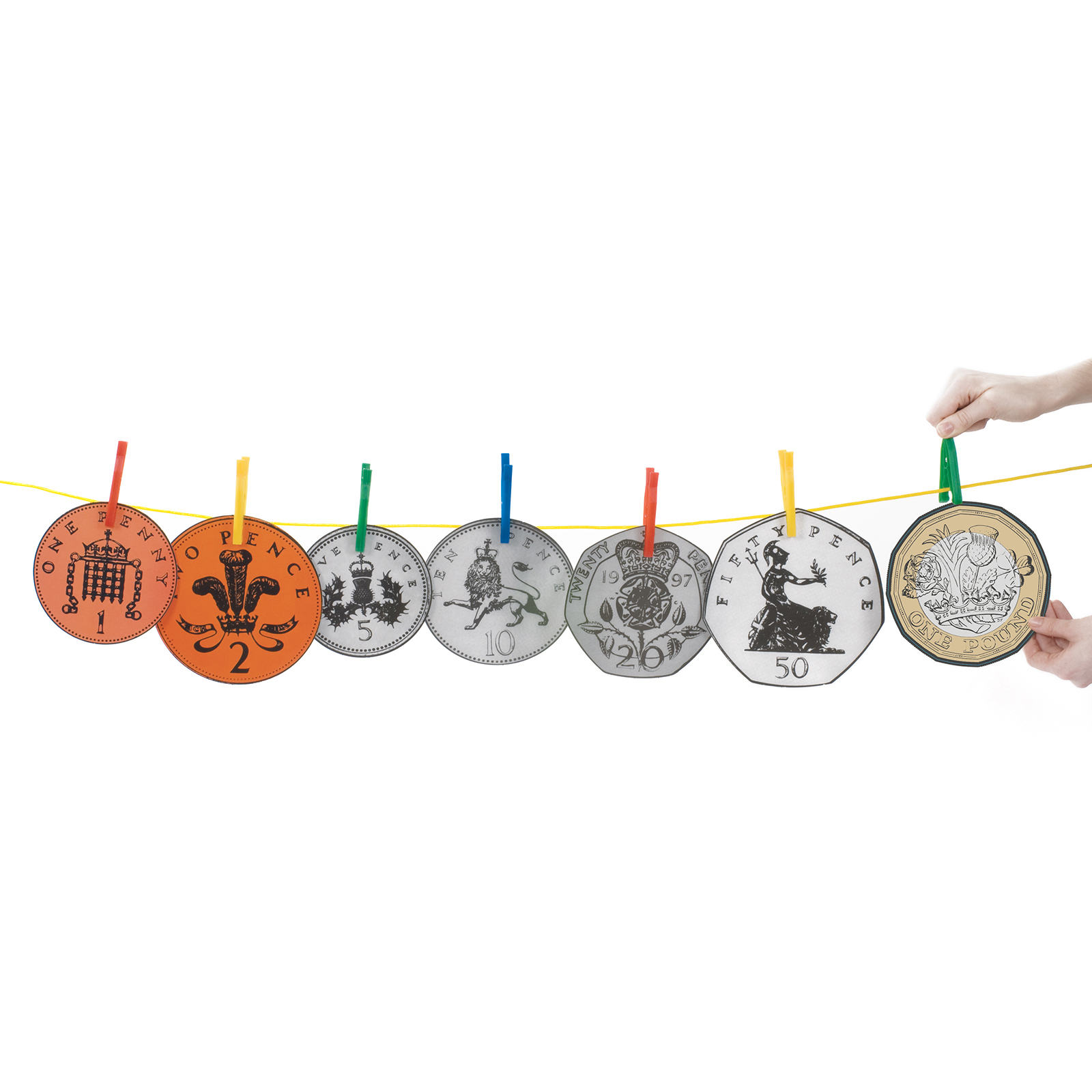 Large money coloured cards cut accurately to the shape of the coins.