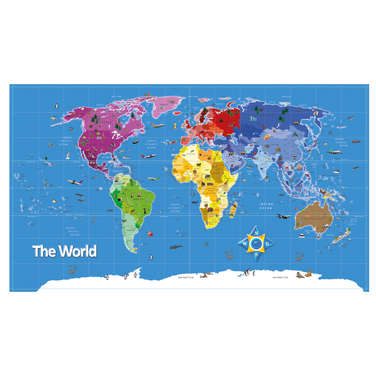 Colour-coded cartography allows for quick distinction between each continent without losing country detail.
