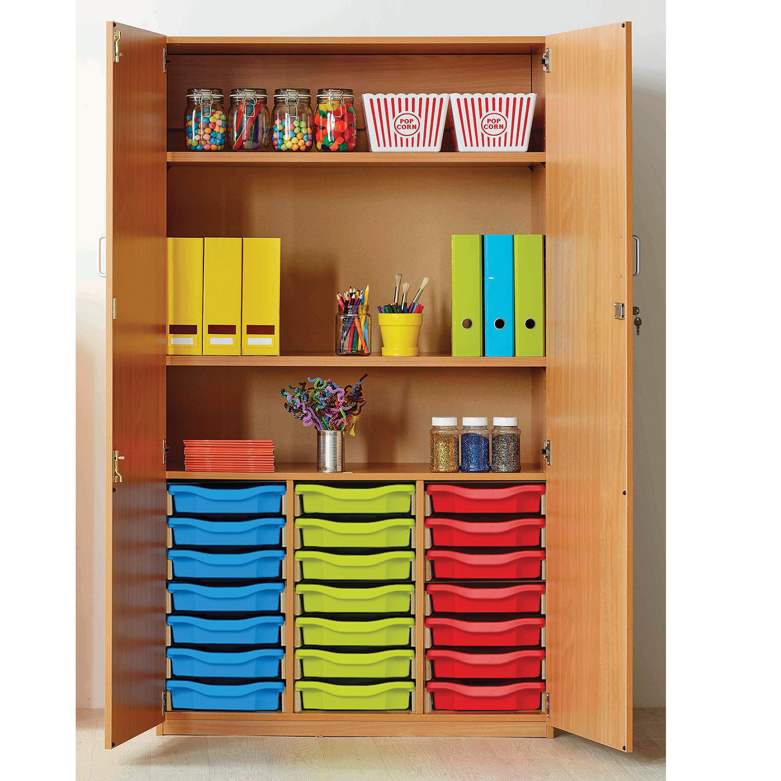 Full height storage cupboard with 21 integrated trays.