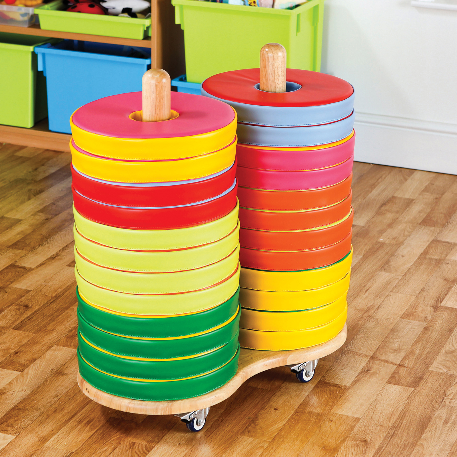This handmade solid wood trolley comes with 24 brightly coloured floor cushions.