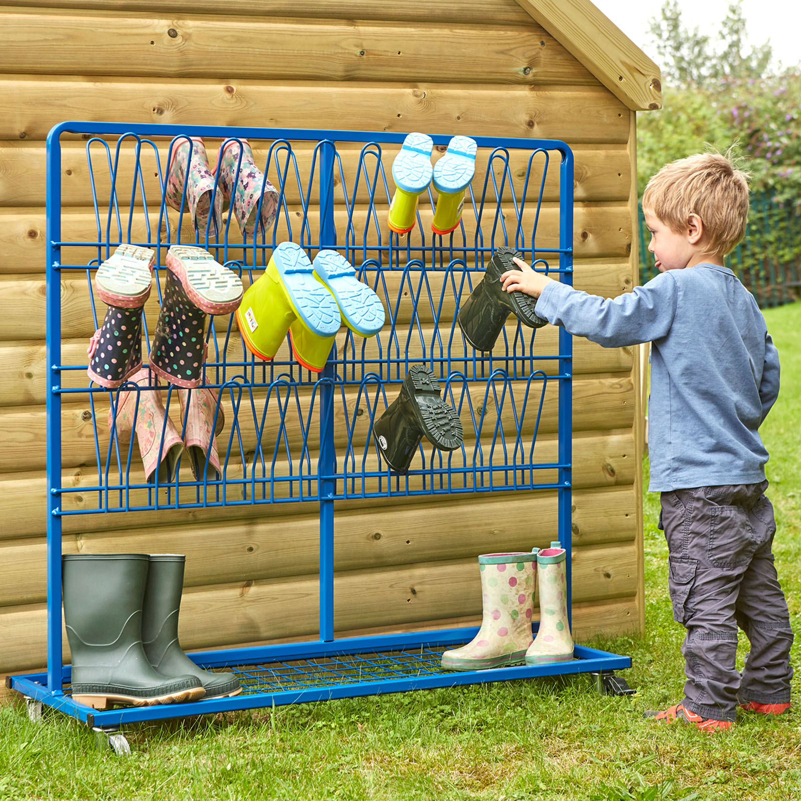 This double sided wellie rack allows for easy access by children from both sides.