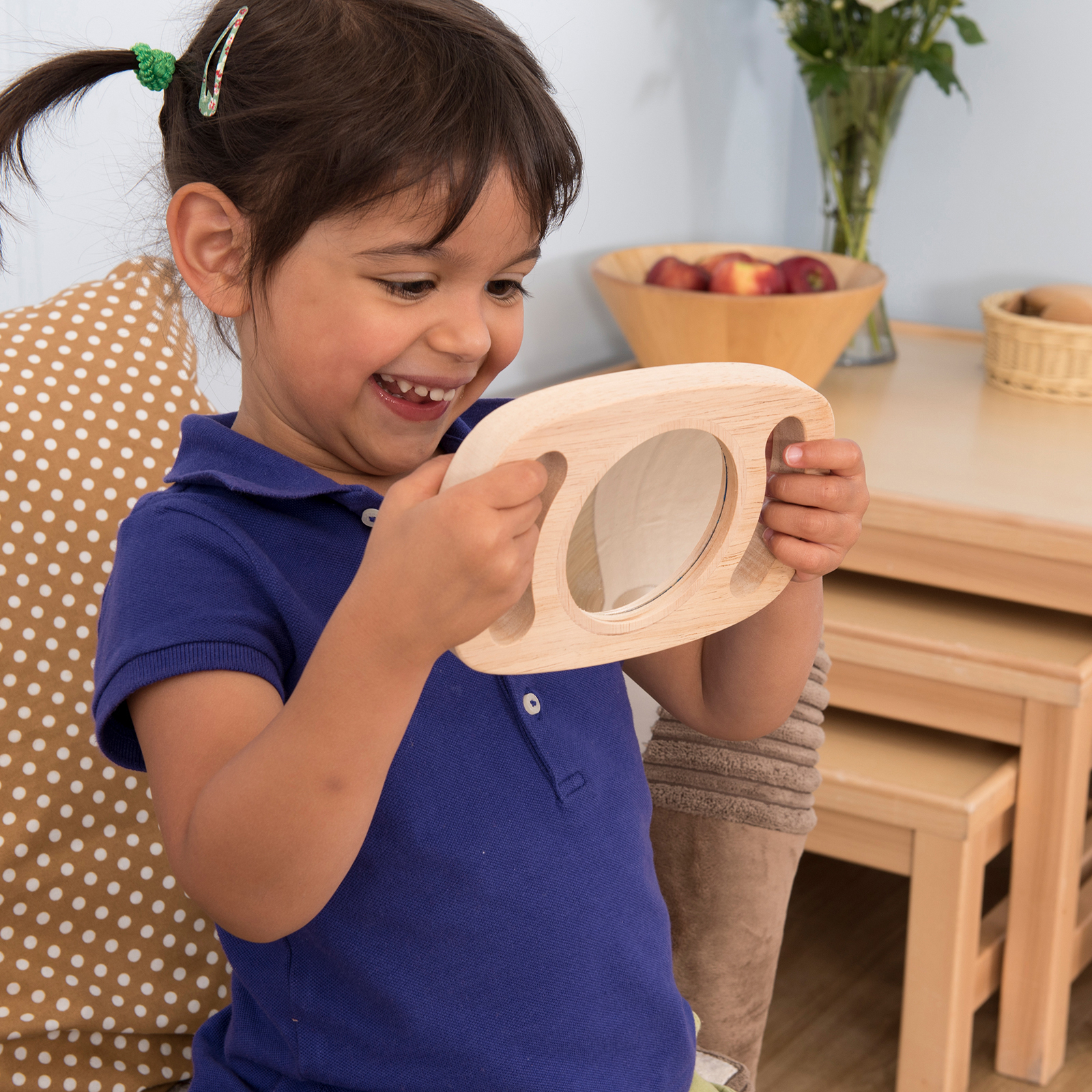 Featuring a regular mirror and a “fun” mirror on the reverse with easy to grip handles in a high quality, tactile wooden finish.