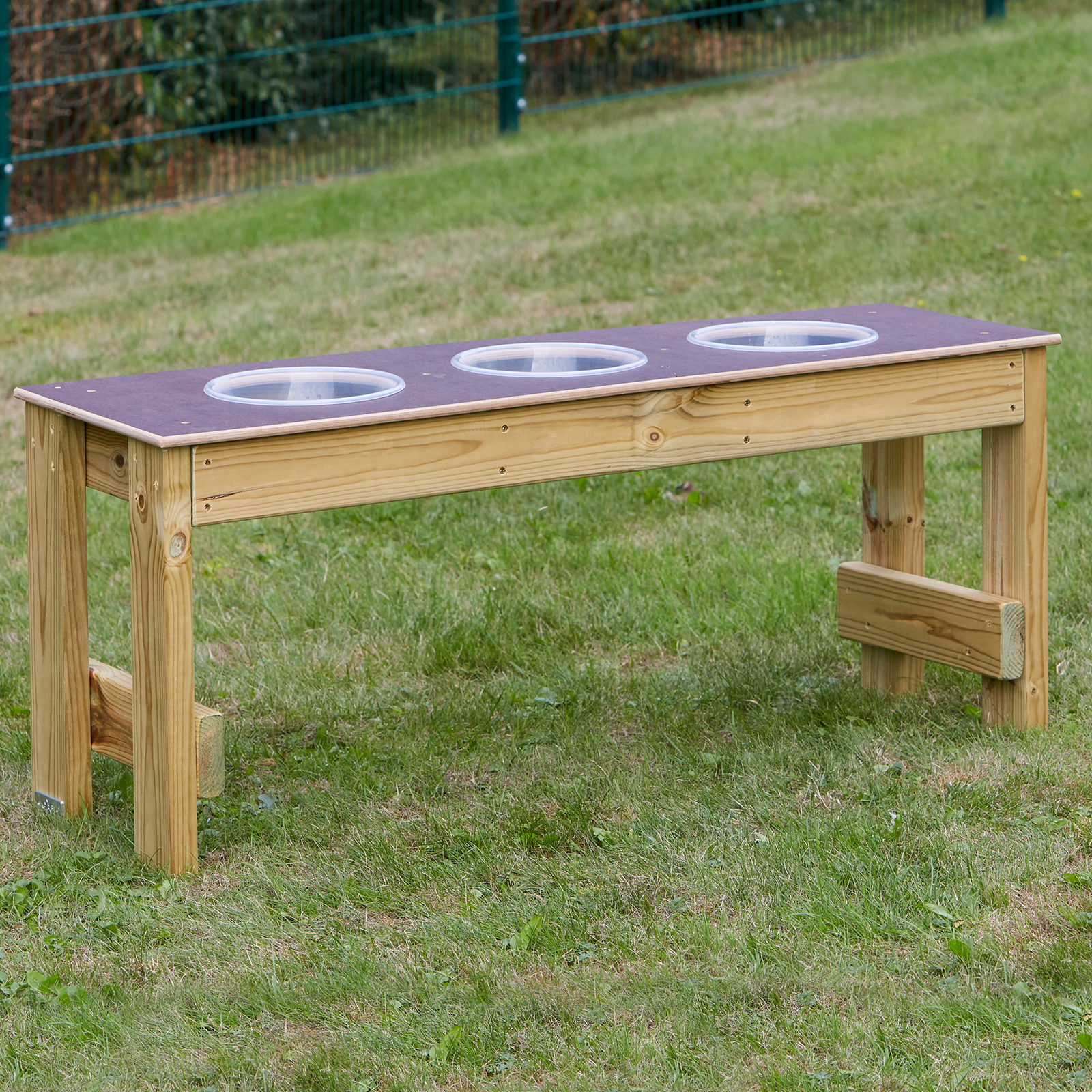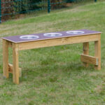 A high quality mud kitchen made from a sturdy wooden bench, with 3 removable bowls, a counter top surface, and space underneath for storage.