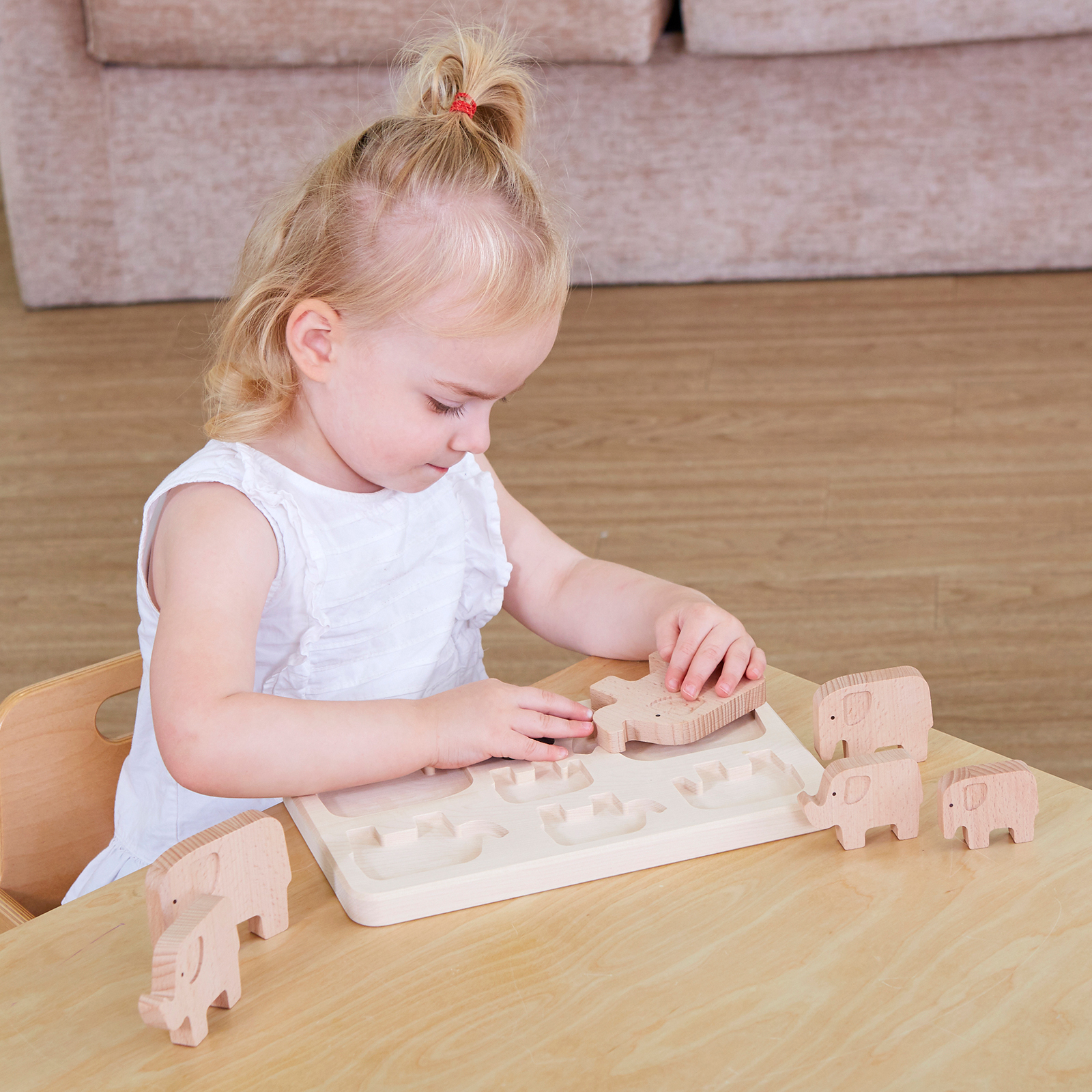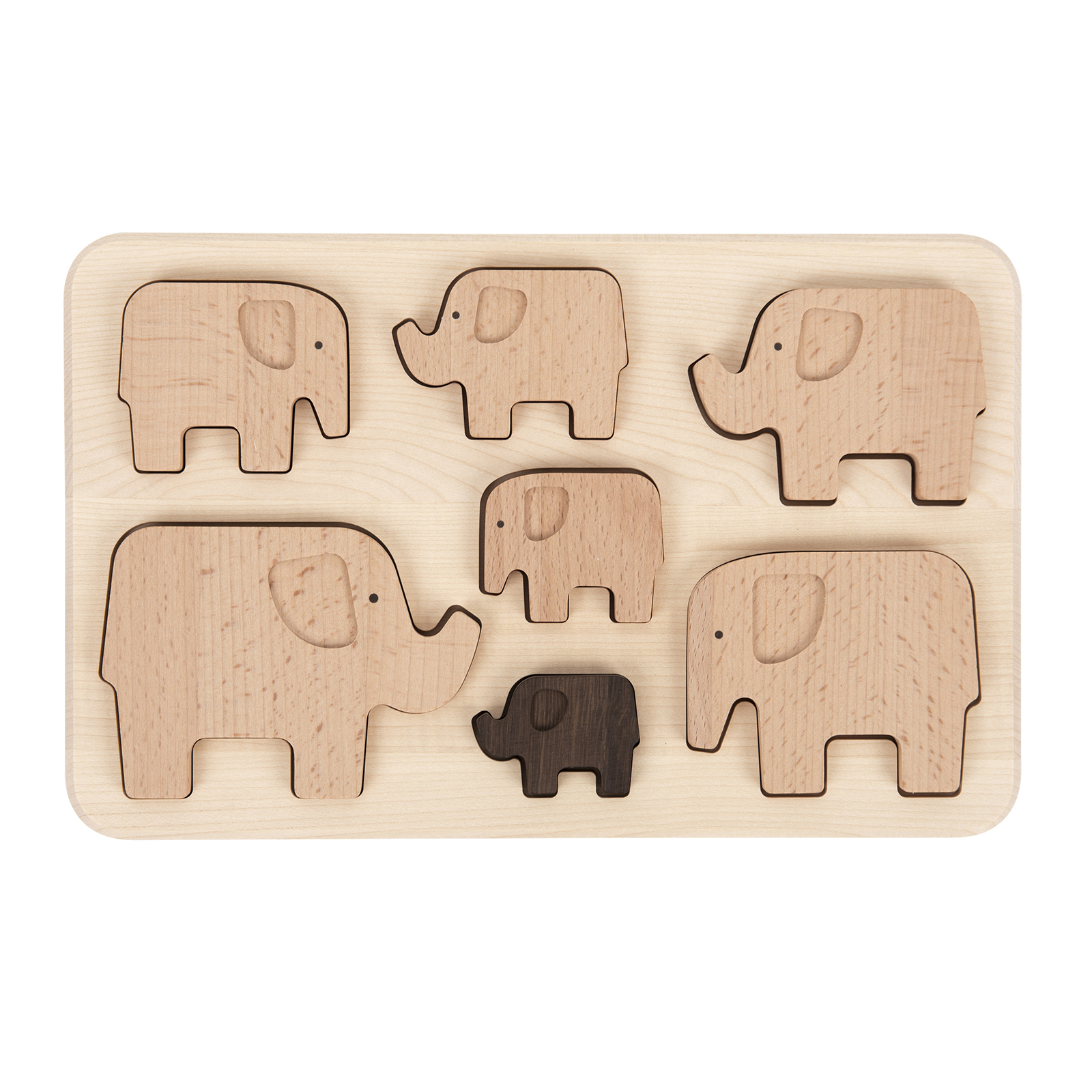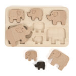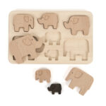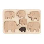A lovely wooden sorting puzzle featuring a family of seven elephants which slot into the included base board.