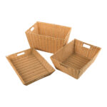 Storage baskets made from a robust plastic for extra strength compared to traditional wicker storage boxes.