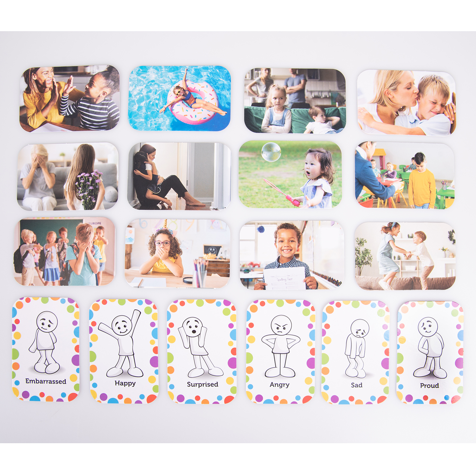 Can be used as a built-on sorting set to sort and match the counters by shape, colour, and emotion