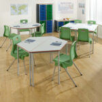 Standard classroom tables in different sizes and colours.