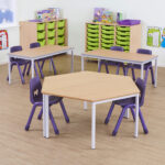 Standard classroom tables in different sizes and colours.
