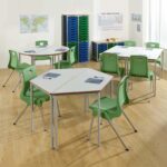 Standard classroom tables in different sizes and colours.
