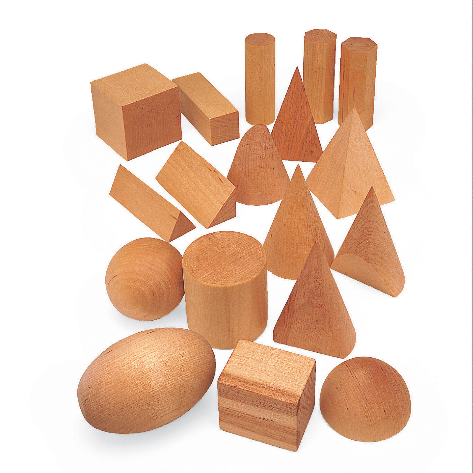 Geometric solid shapes in smooth hardwood.