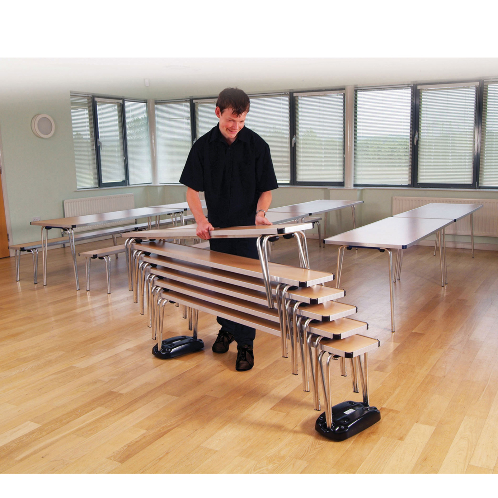 Stackable benches with robust design for use in school canteens and dining halls.