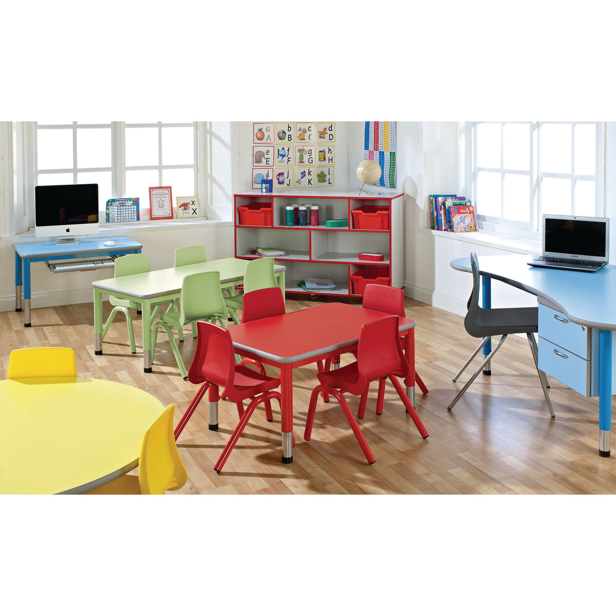 The possibilities are endless with these height adjustable tables. Offering ultimate versatility, the easily adjusted legs can be set at heights from 40 to 64cm, making them suitable for both key stage one and two. The brightly coloured tops are constructed from a hard-wearing, wipe clean laminate that is resistant to chipping, and the steel tubular legs give a clean, modern look.