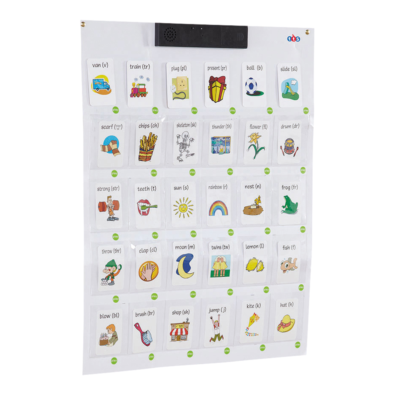 The recordable wall chart has 30 pockets each with a 10 second recording button.