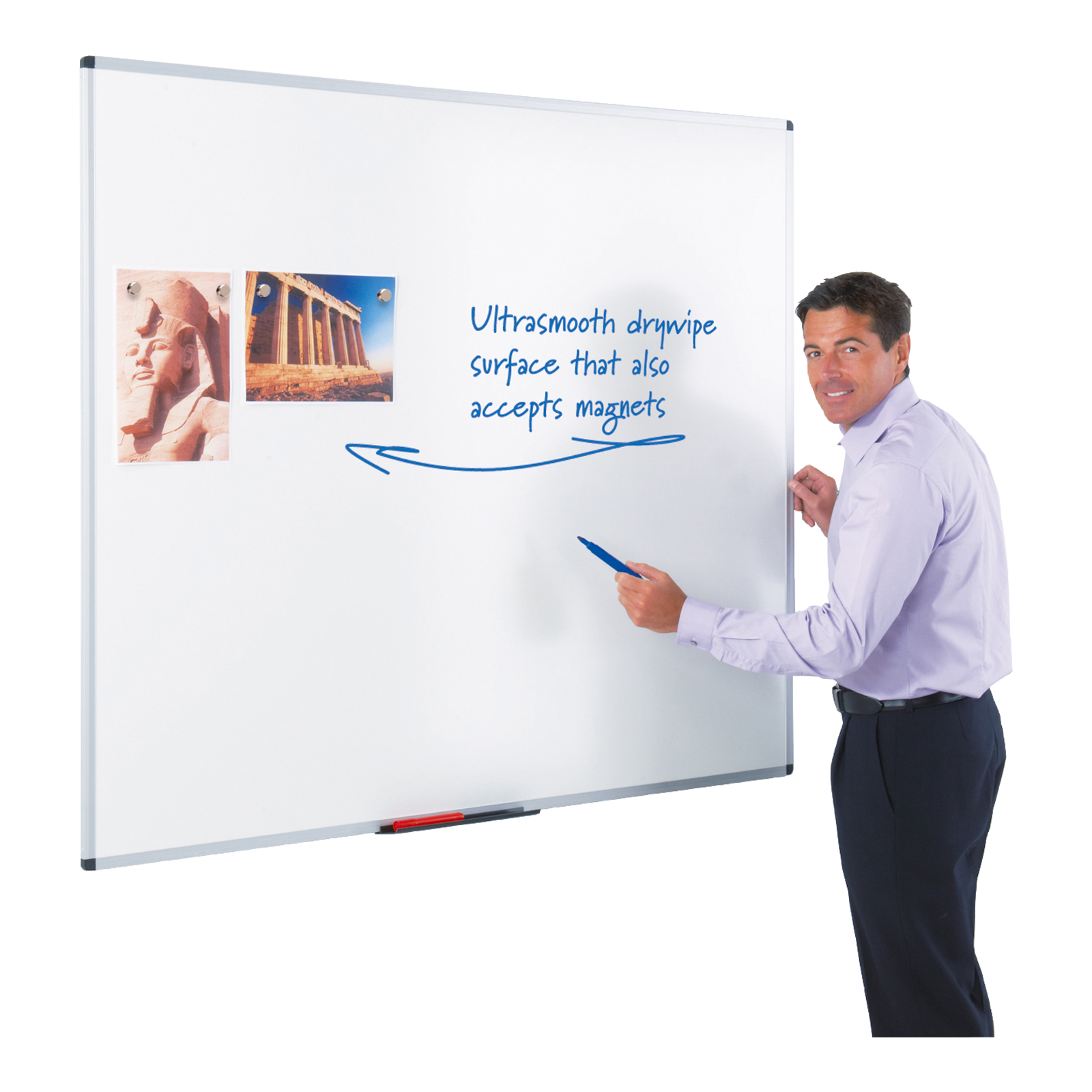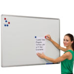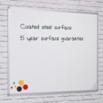Magnetic whiteboard constructed from coated steel with a satin silver anodised aluminium frame.
