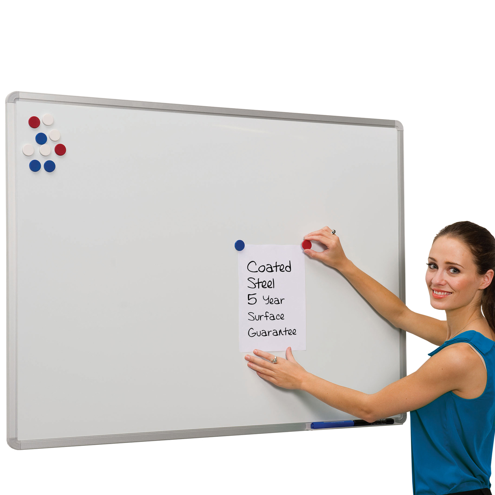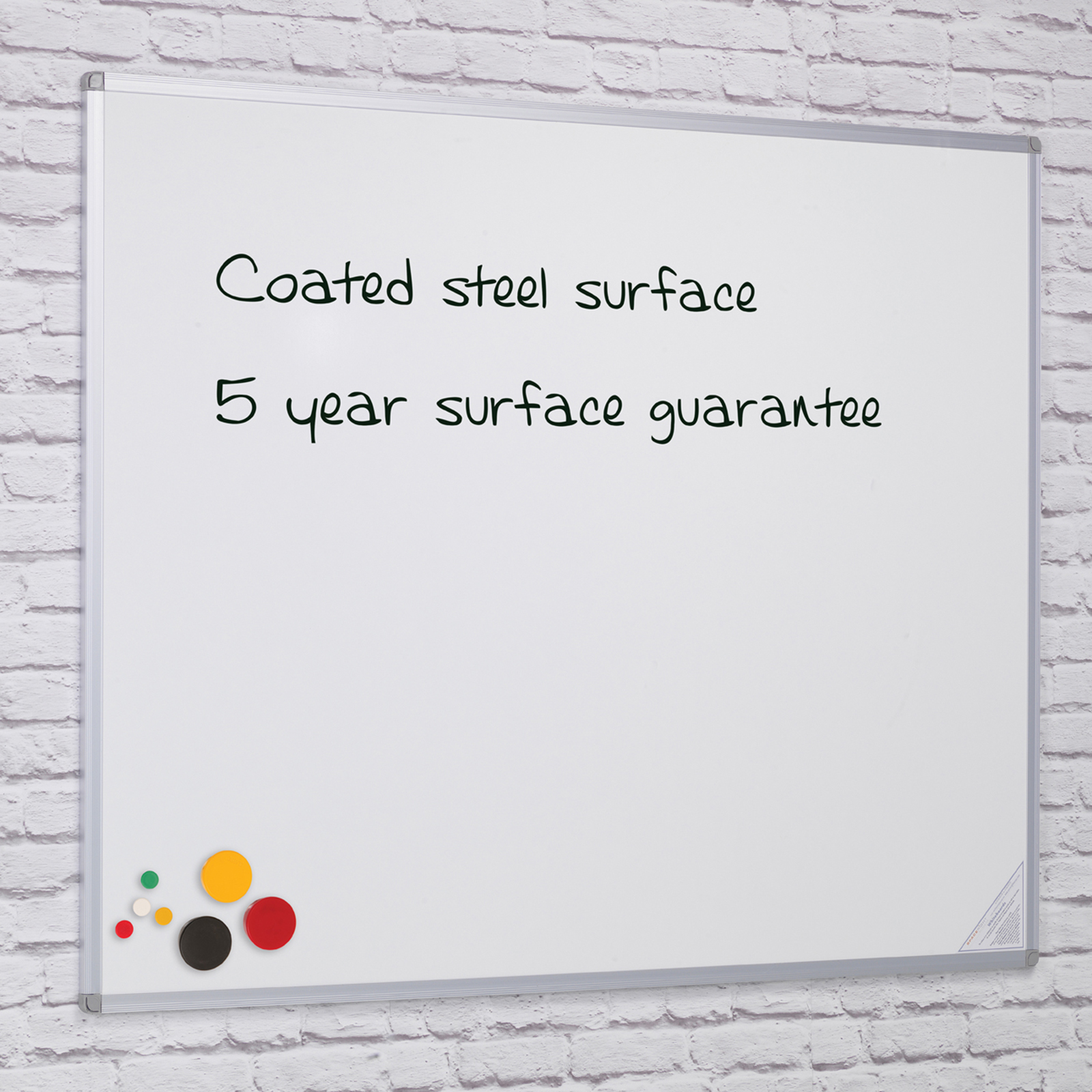Magnetic whiteboard constructed from coated steel with a satin silver anodised aluminium frame.