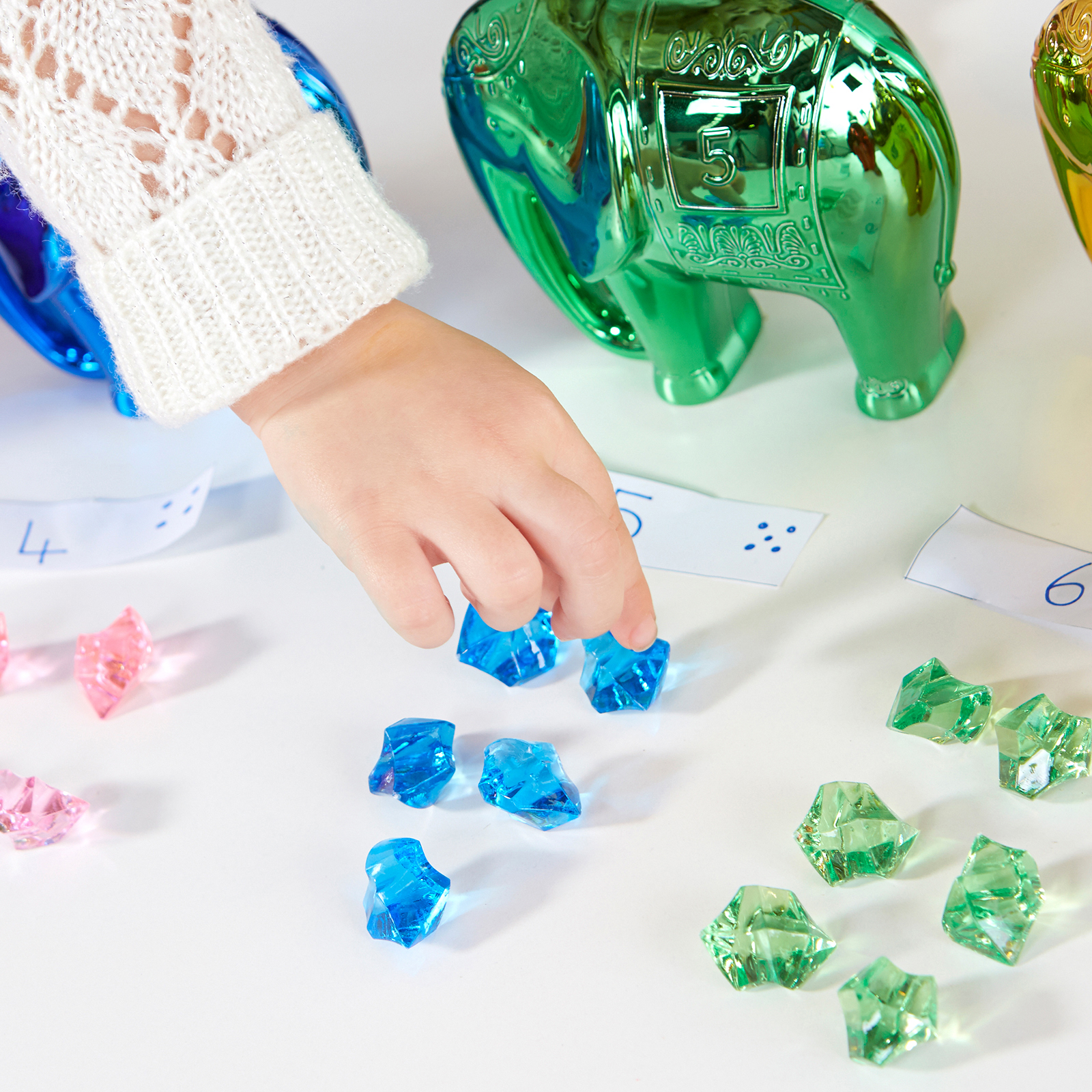 A beautiful, jewel-like collection of metallic numbered elephants that can be used in maths for number recognition, counting, prepositions, etc.