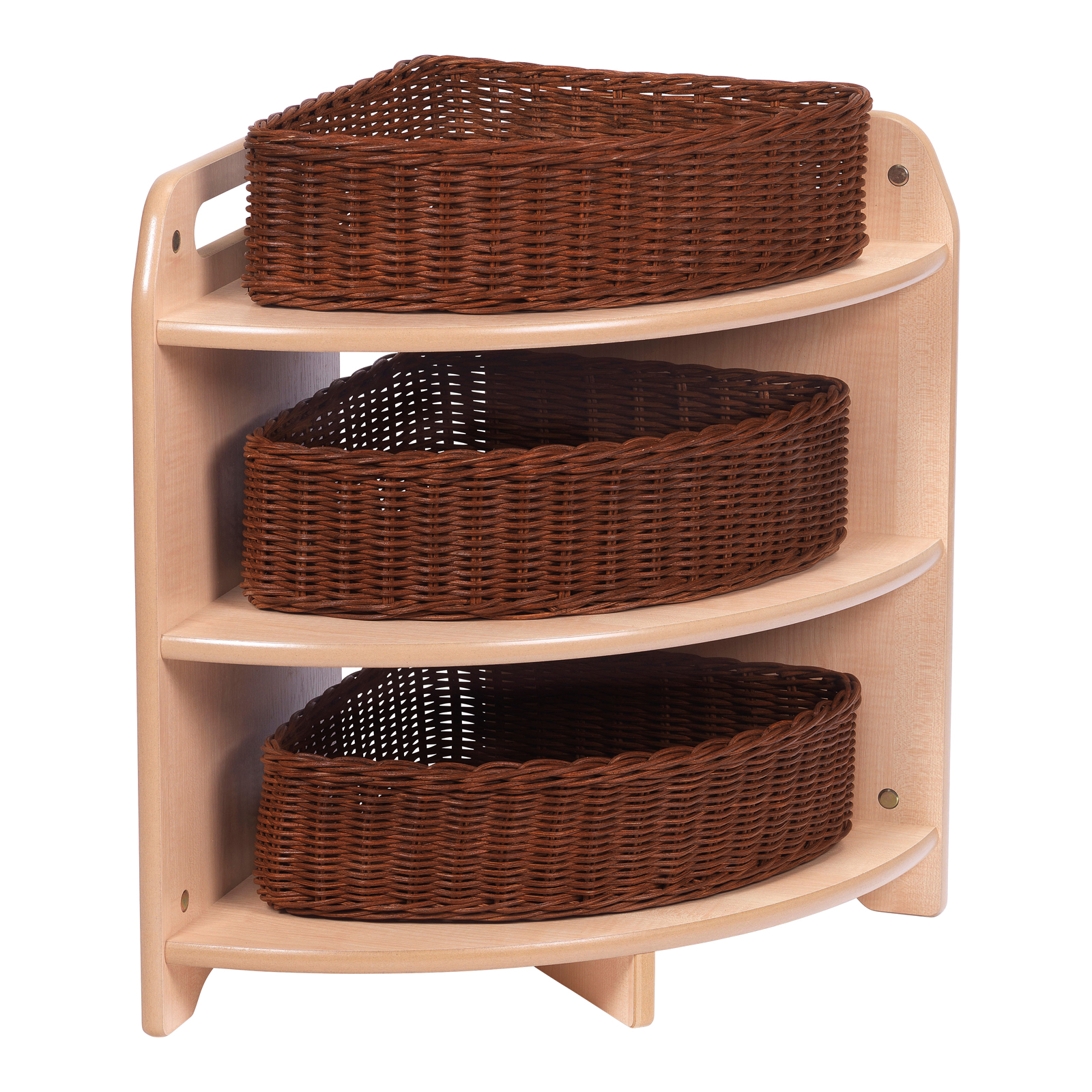 A corner storage unit with space for three included wicker baskets or clear tubs.
