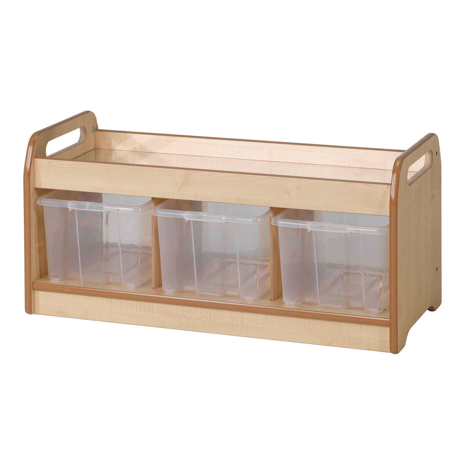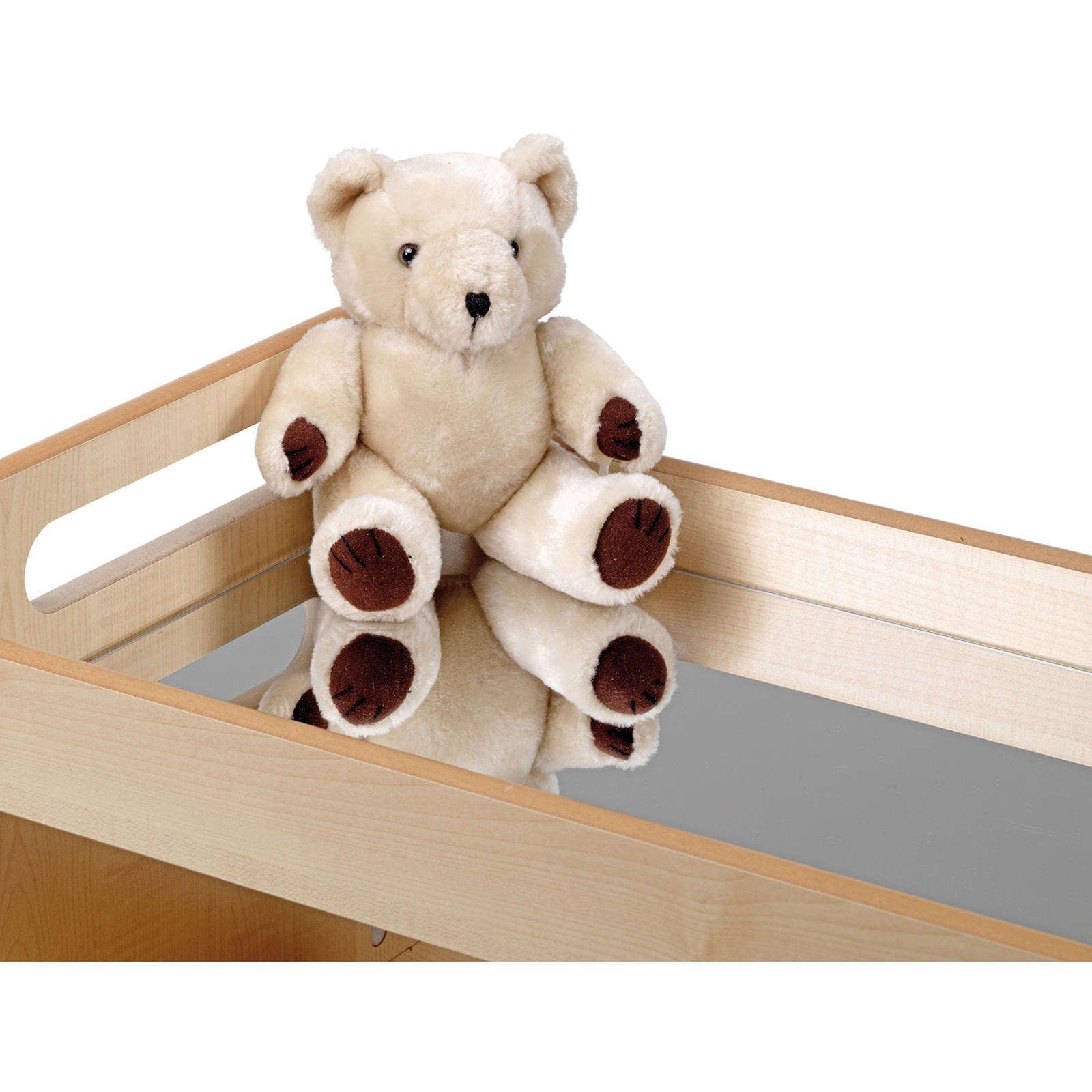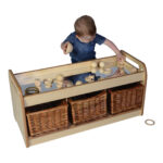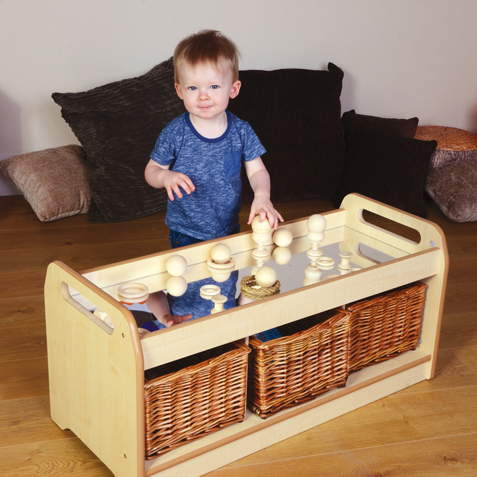 Easy access nursery storage unit for toddlers and children, featuring a mirror top which is ideal for exploratory play.