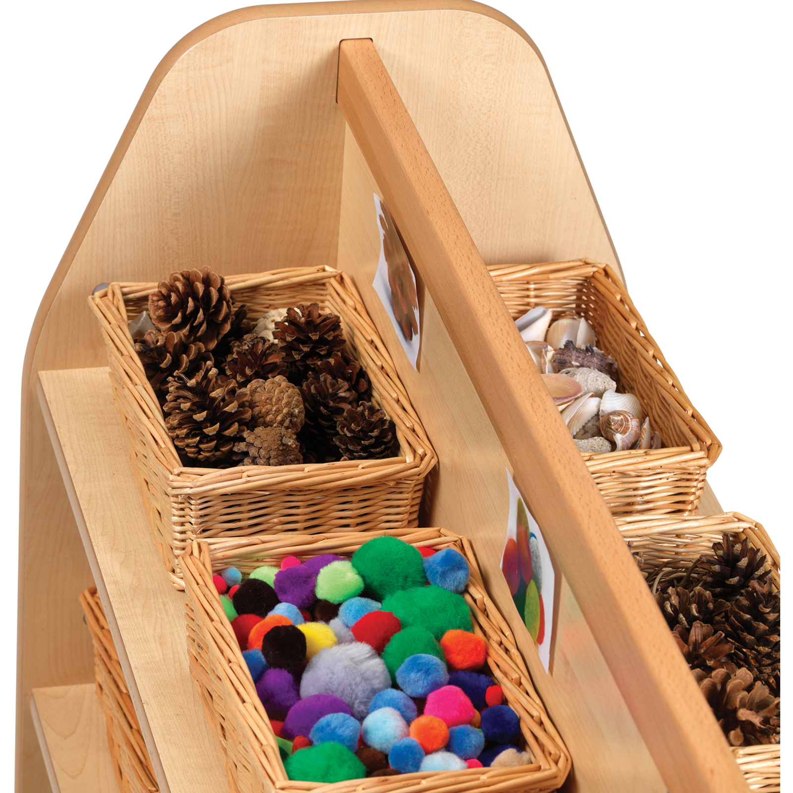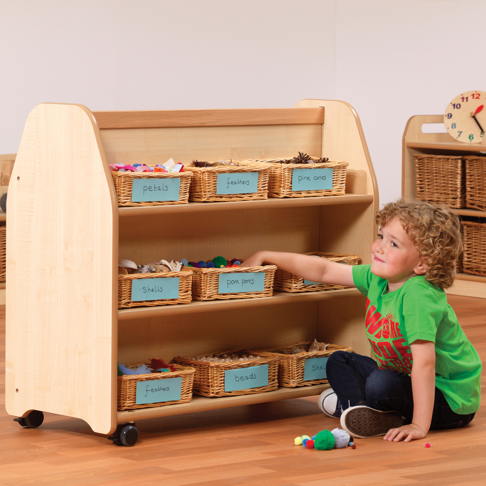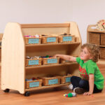 This double sided storage trolley allows for easy yet efficient nursery and classroom storage.