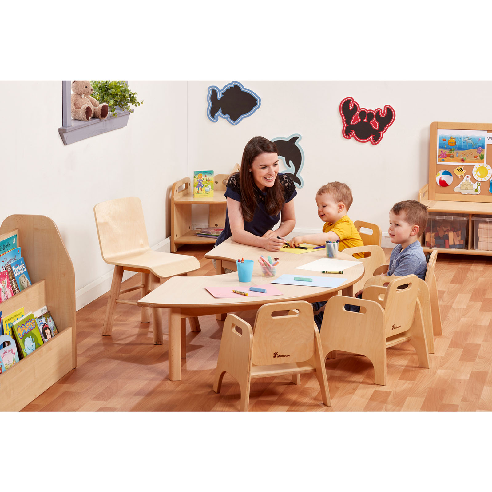 This sturdy semi-circe children’s table is suitable for seating up to 6 children.