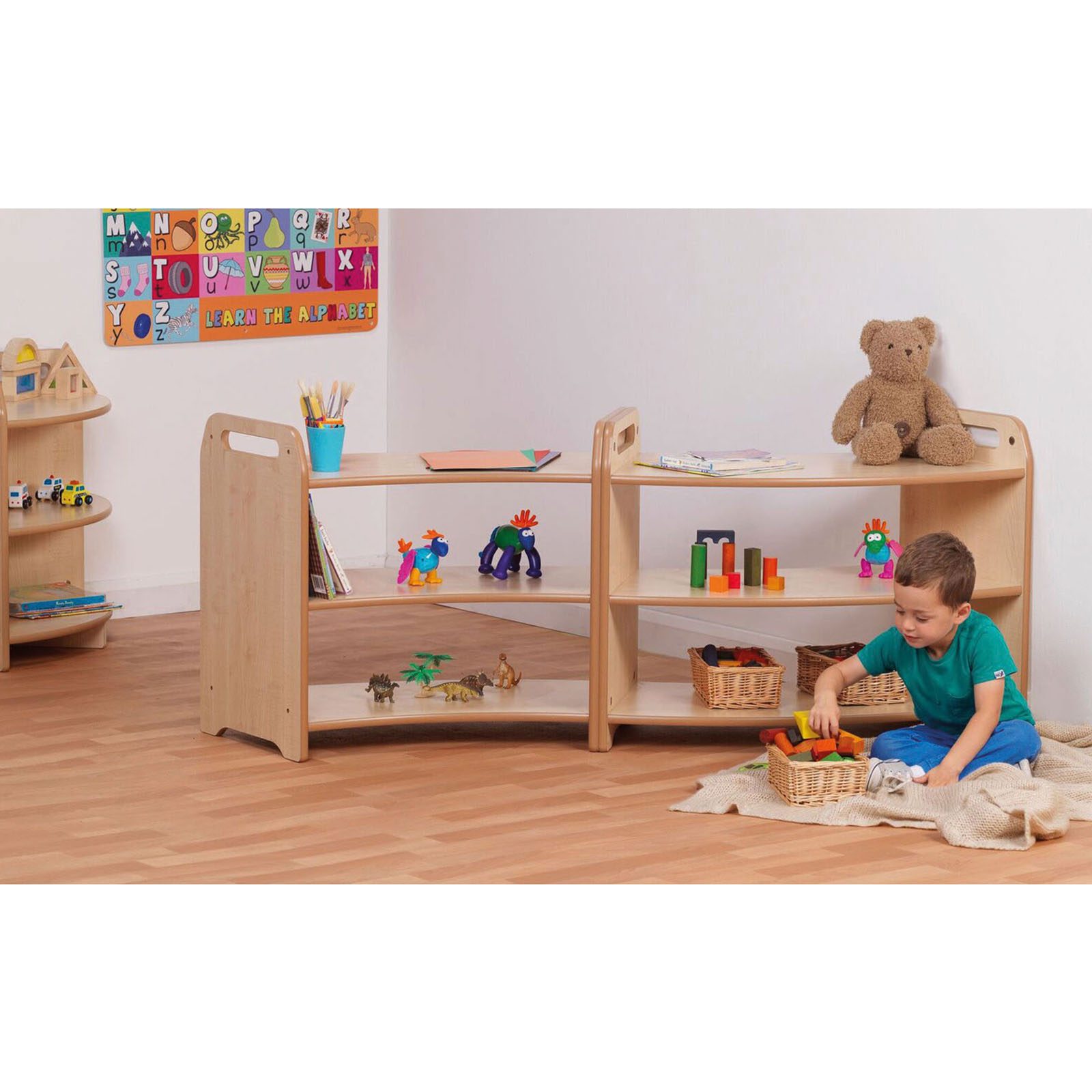Storage shelves ideal for use as nursery or classroom storage to allow children to easily access resources.
