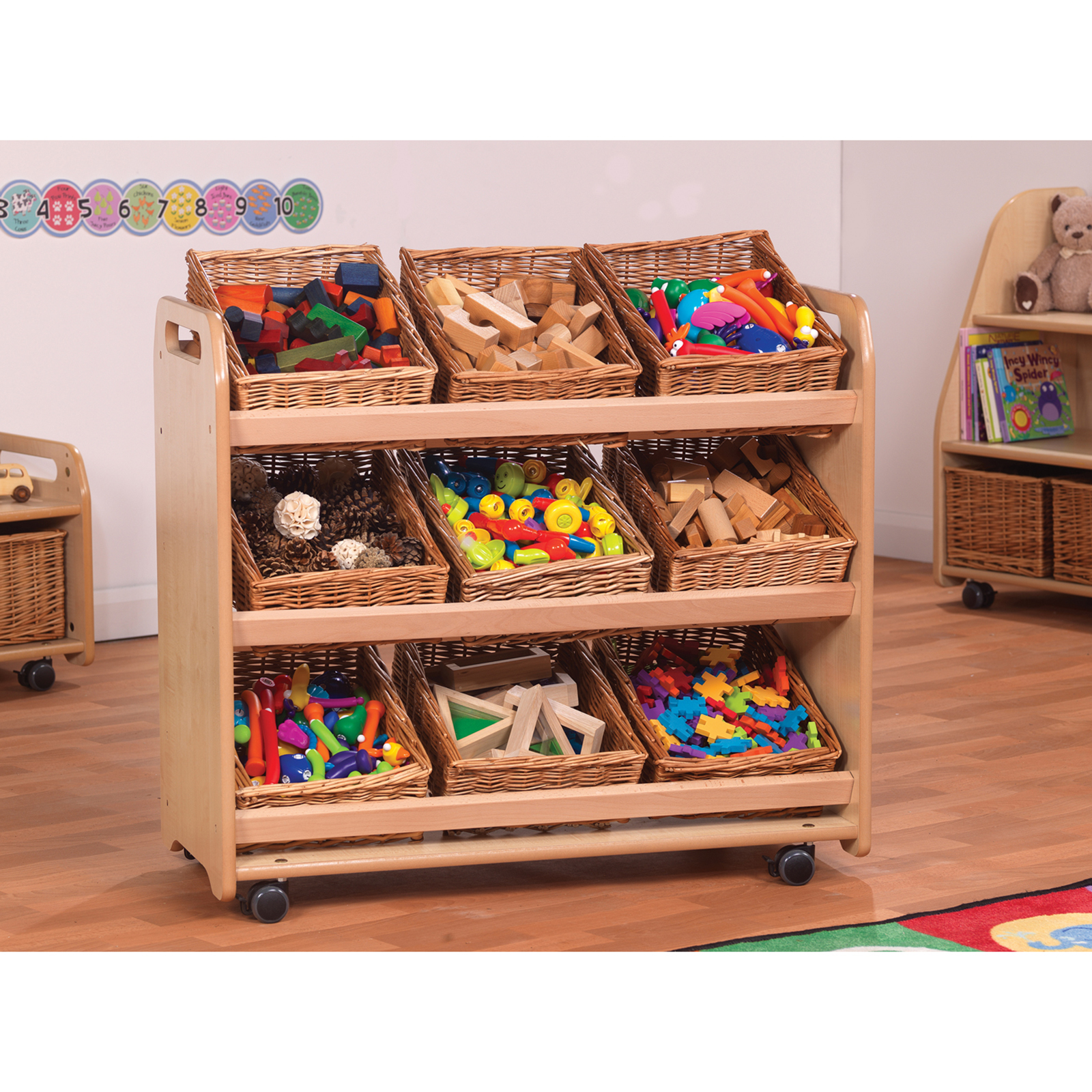 A storage trolley with 9 baskets or clear plastic tubs included for storing craft materials, role play accessories or other learning resources.