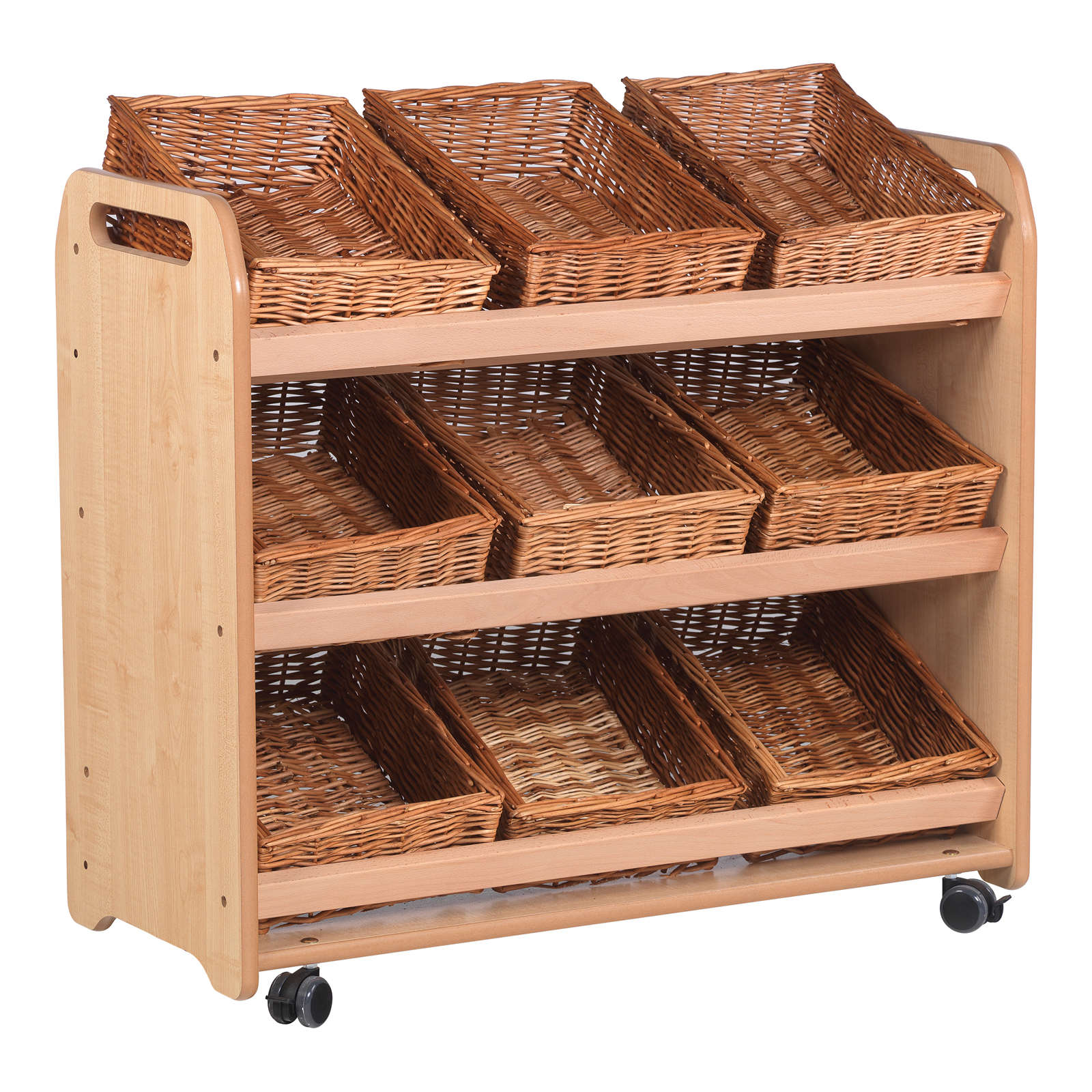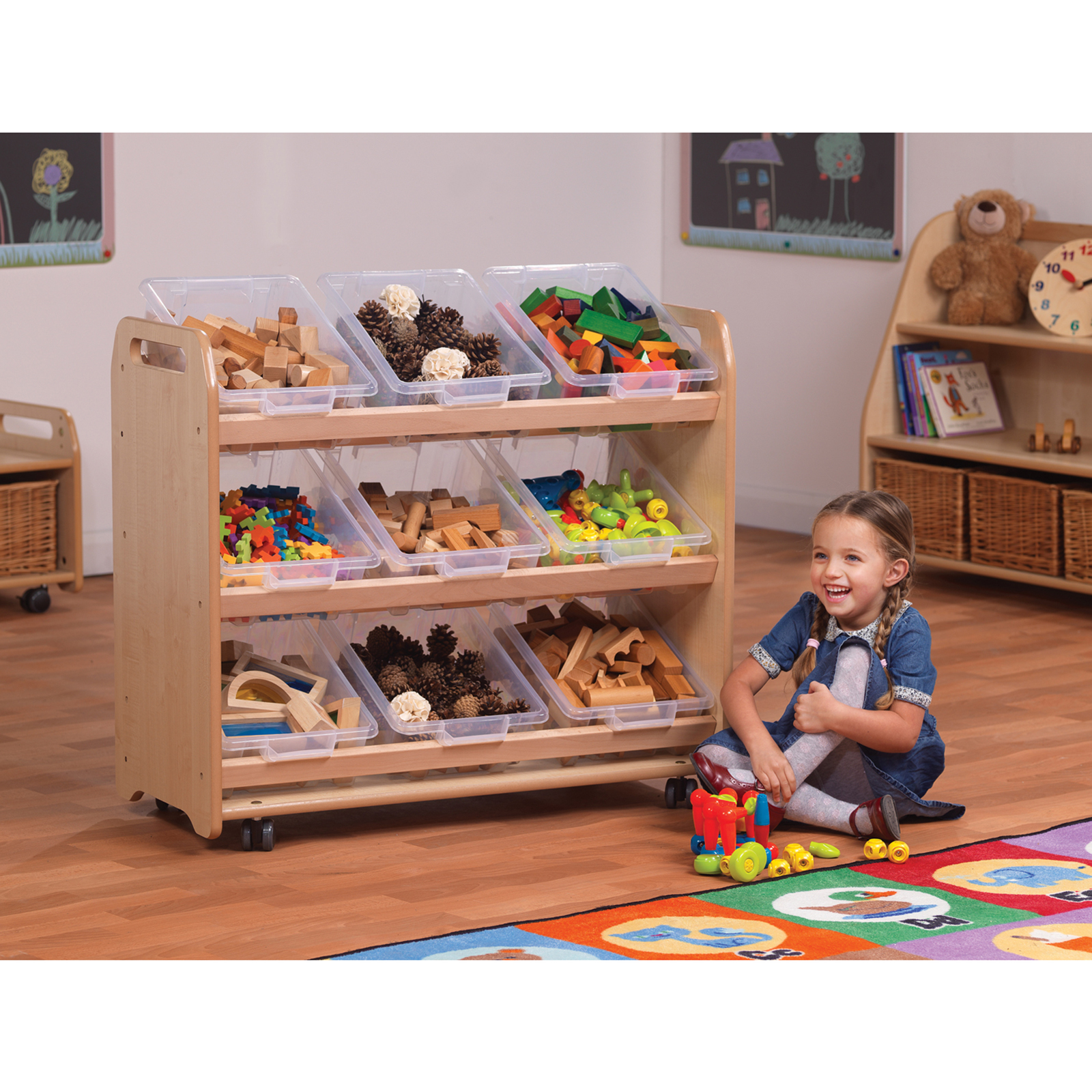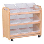 A storage trolley with 9 baskets or clear plastic tubs included for storing craft materials, role play accessories or other learning resources.
