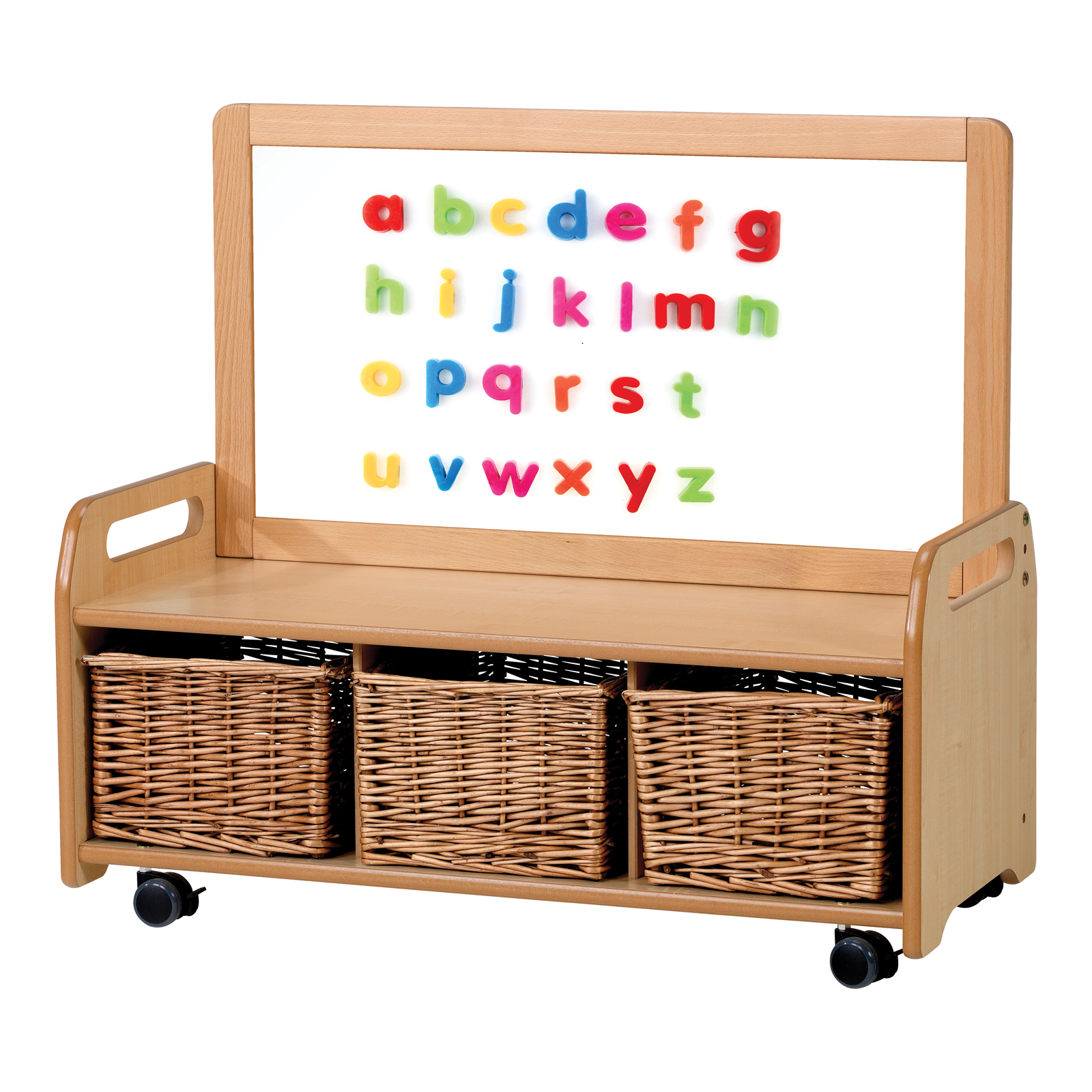 This low level mobile storage unit is accompanied by a removable double sided magnetic whiteboard.