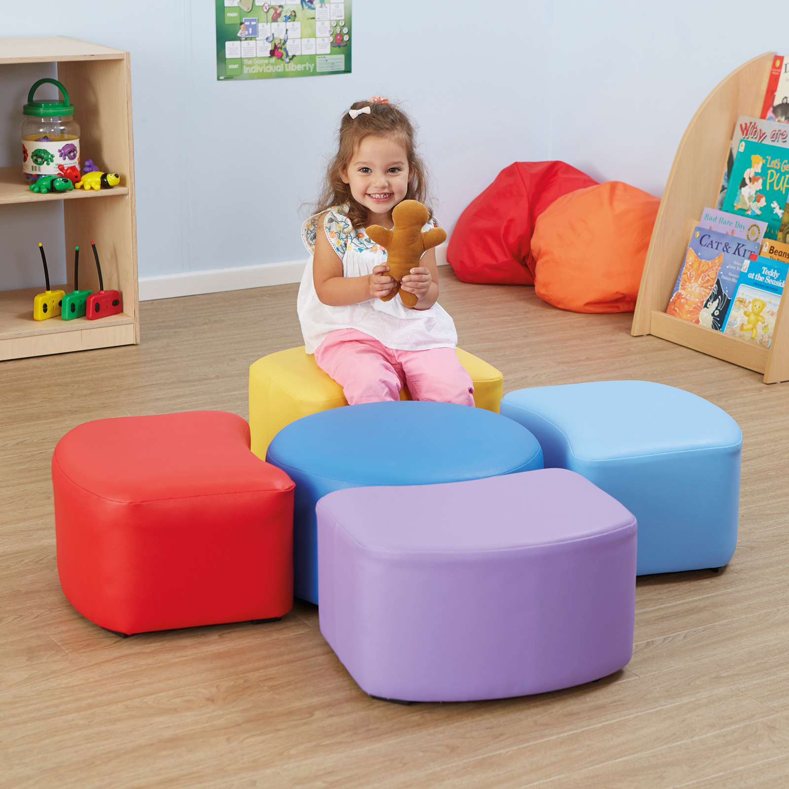Set of five modular seats ideal for lots of different places in your setting or school.