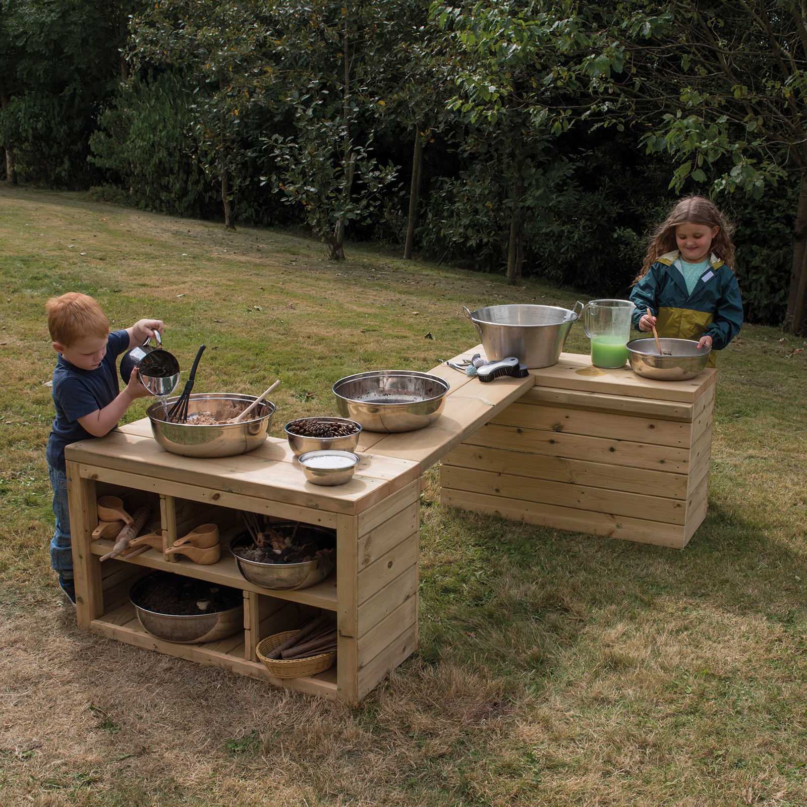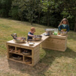 Create endless storage and play possibilities with this wooden shelving and table set.