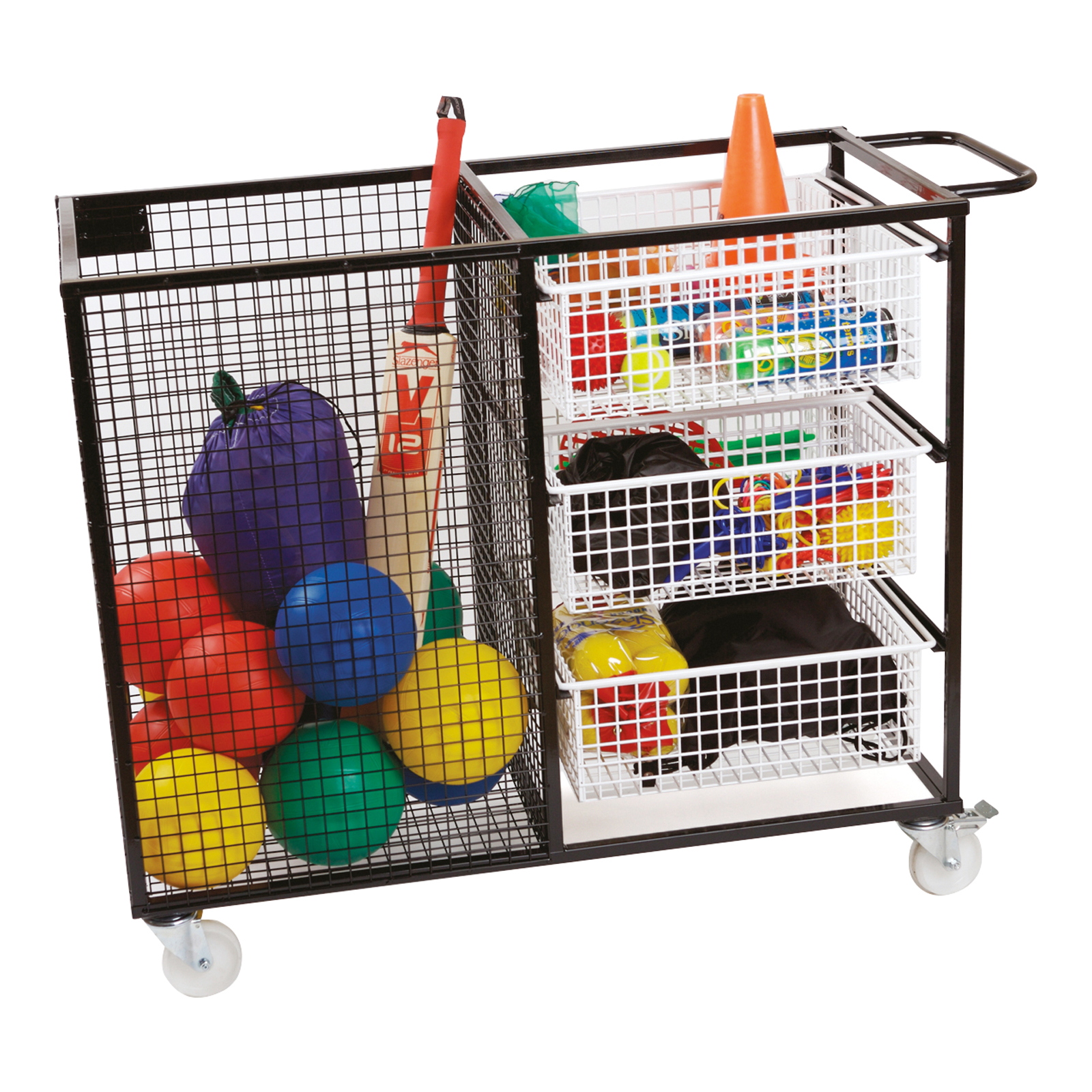 A storage trolley with one large basket and six small mesh drawers suitable for storing a range of different products.