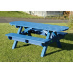 The recycled plastic picnic bench has an extended top to accommodate 2 wheelchair users at each end of the table.