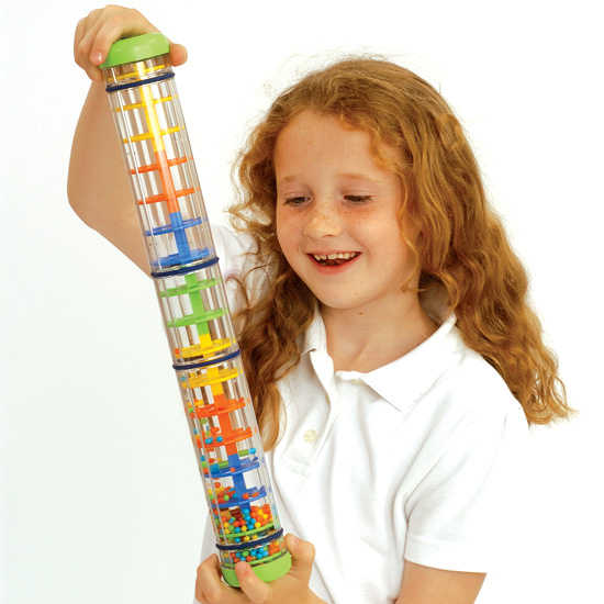 Filled with multi-coloured beads which cascade through the clear plastic to create the sound of falling rain.