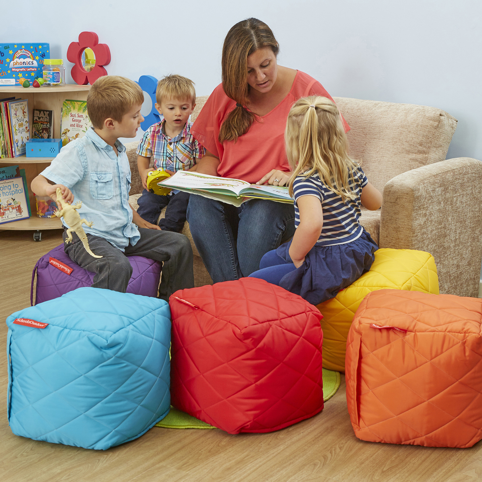 These attractive chunky cube beanbags make an excellent place to sit.