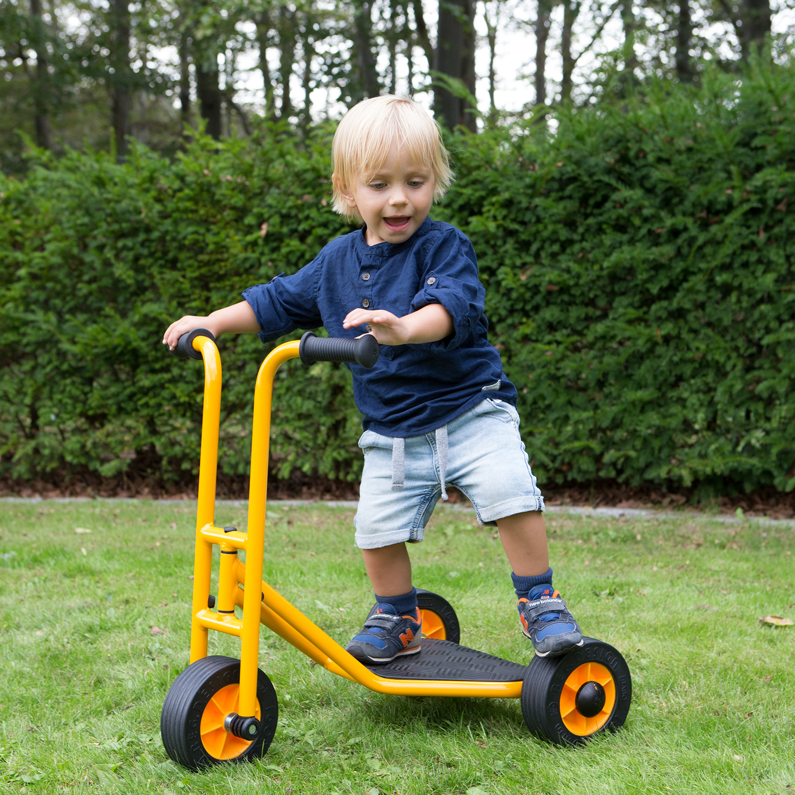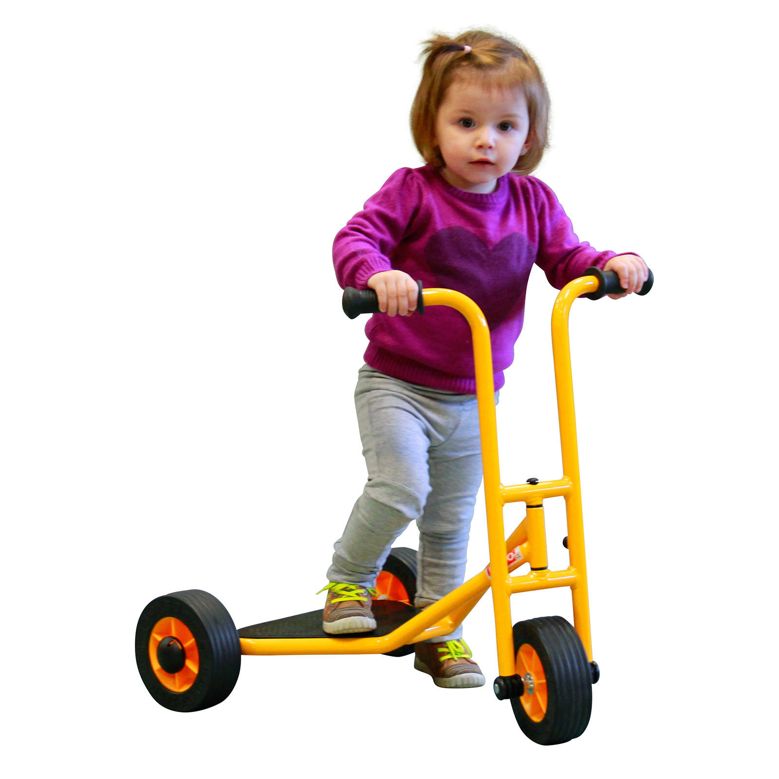 This robust, three-wheeled scooter, by Rabo, has an 18 inch rear wheel base and wide tyres making it extremely safe and stable. Suitable for age 10 months and up.