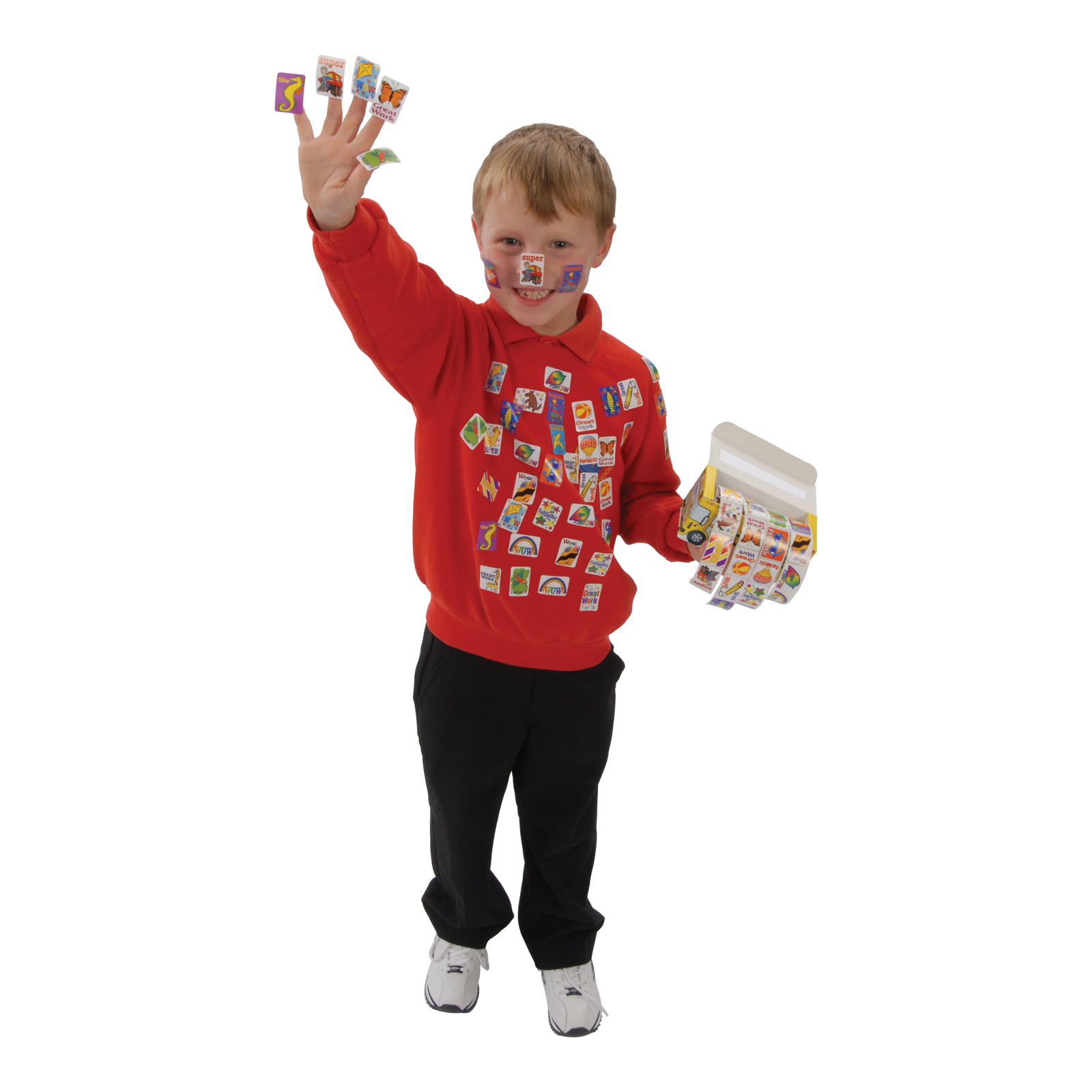 Bright and colourful rectangular motivational stickers, stored inside a decorative bus-shaped box.