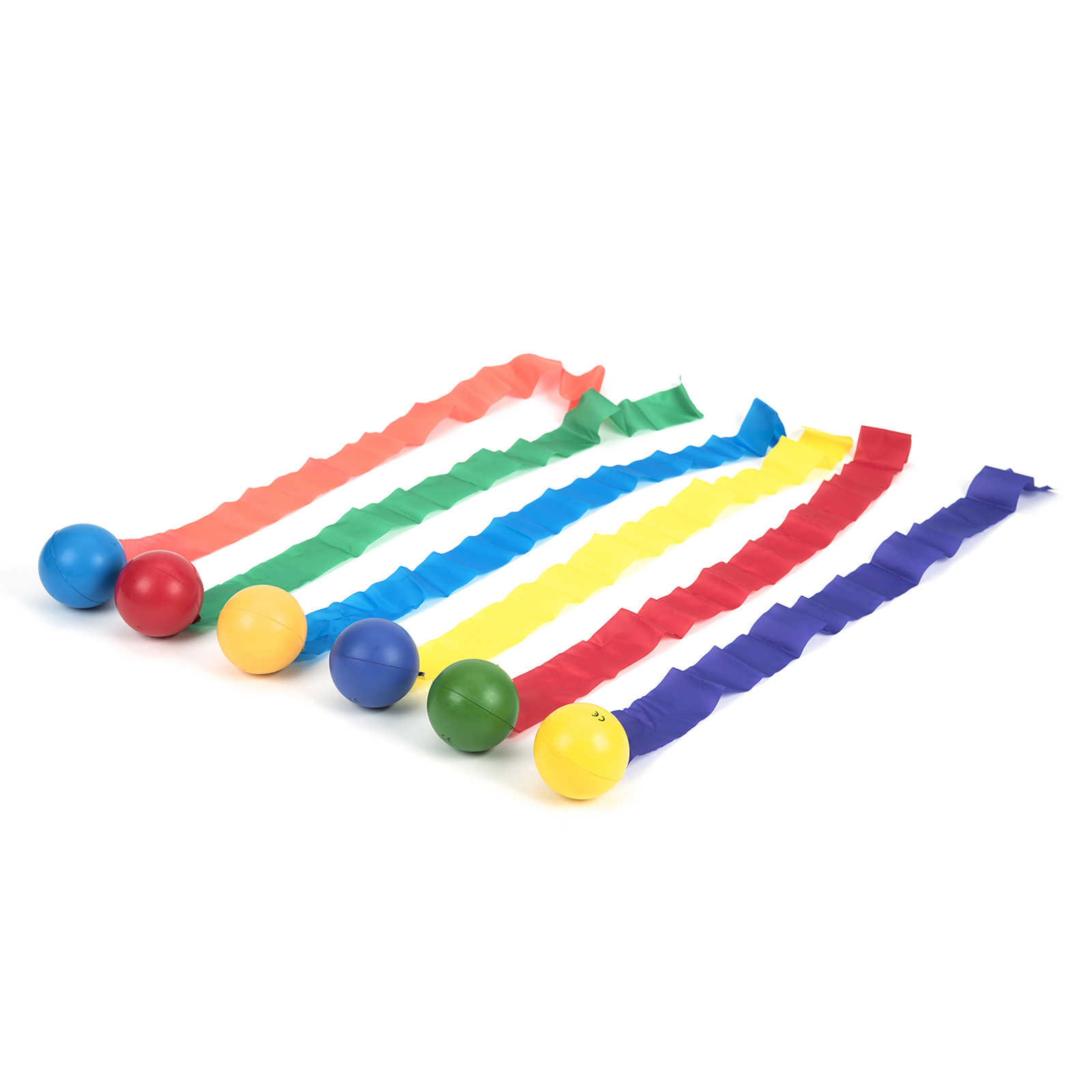 A set of brightly coloured foam balls with equally bright ribbon tails attached.