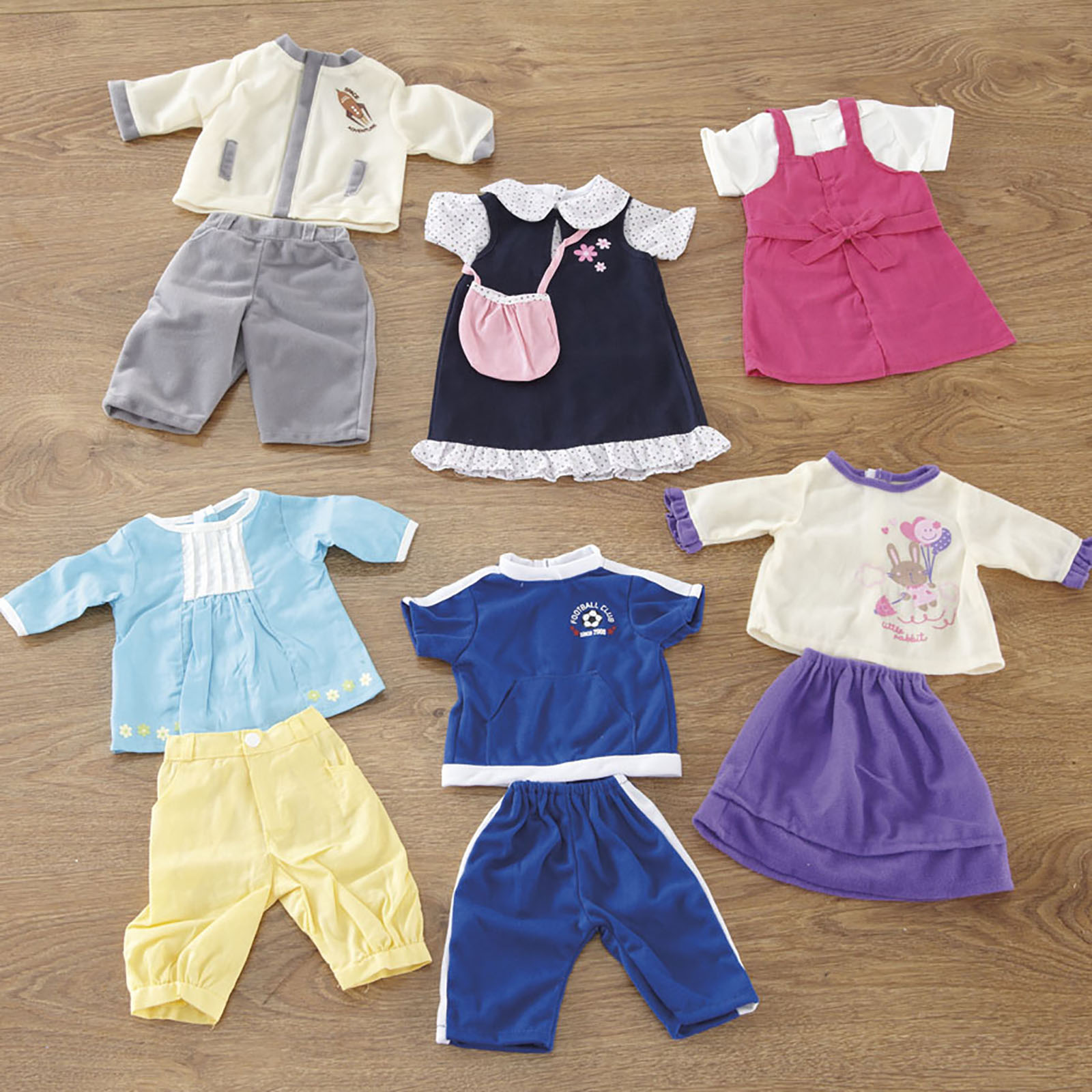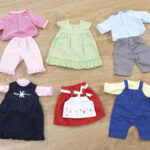 Sets of brightly coloured clothes to dress up dolls of different sizes.