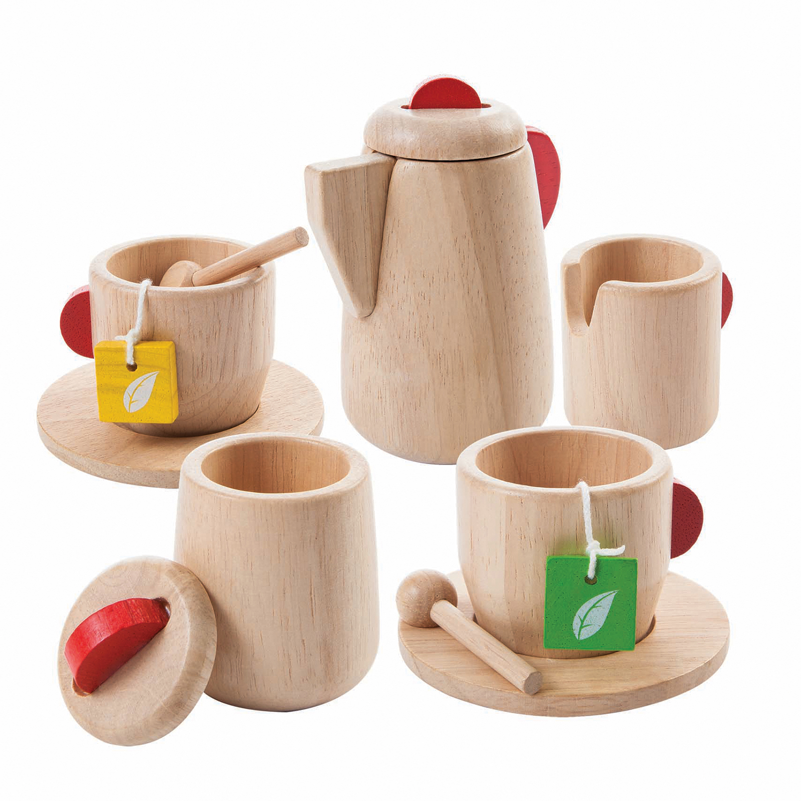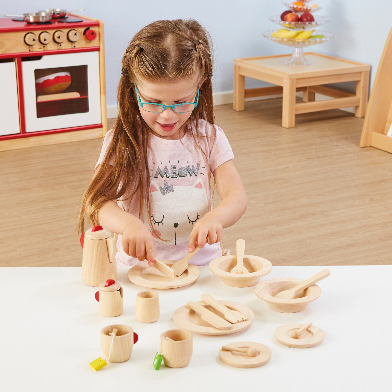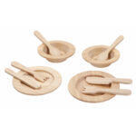 A set of natural wooden cutlery and tableware, ideal for use in your home corner.