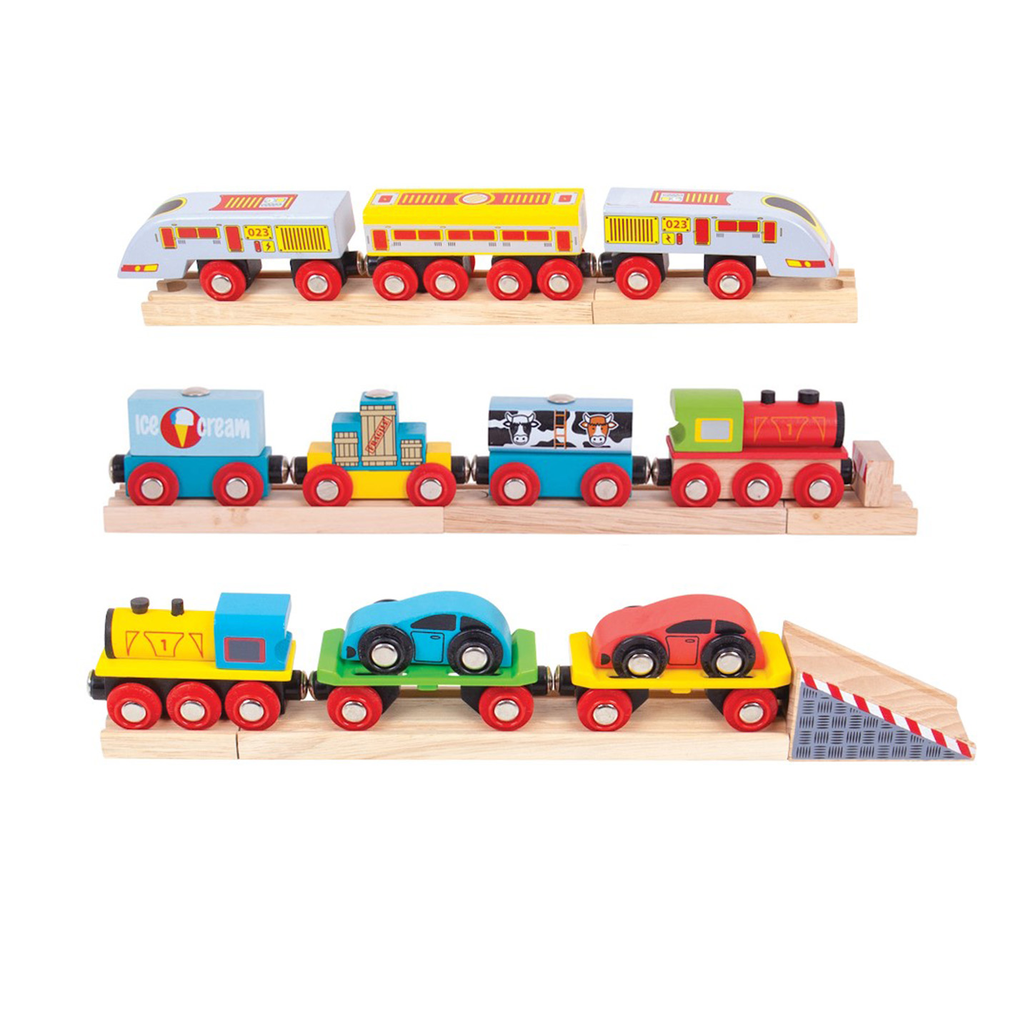 Ideal for small world play and communication, each train has a different theme.