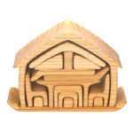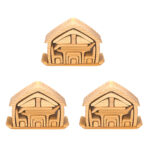 A set of three beautifully crafted, open ended wooden houses.