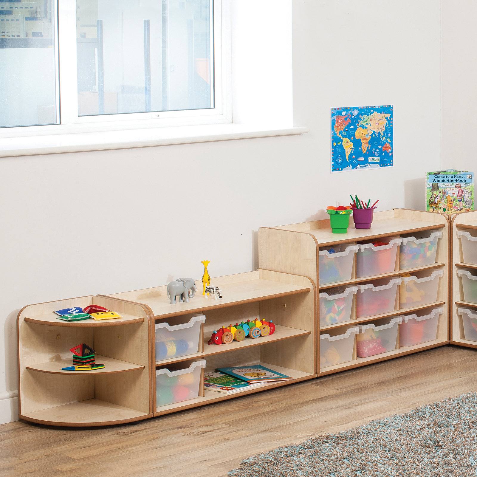 Robust, durable corner unit with two shelves, ideally sized for early years.