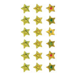 Star shaped smiley stickers with a sparkly gold effect.