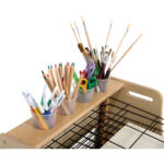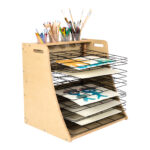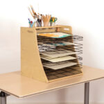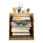 Sturdy, lightweight wooden table top drying rack and storage unit that keeps wet art projects safely stored off the classroom tables and work areas.